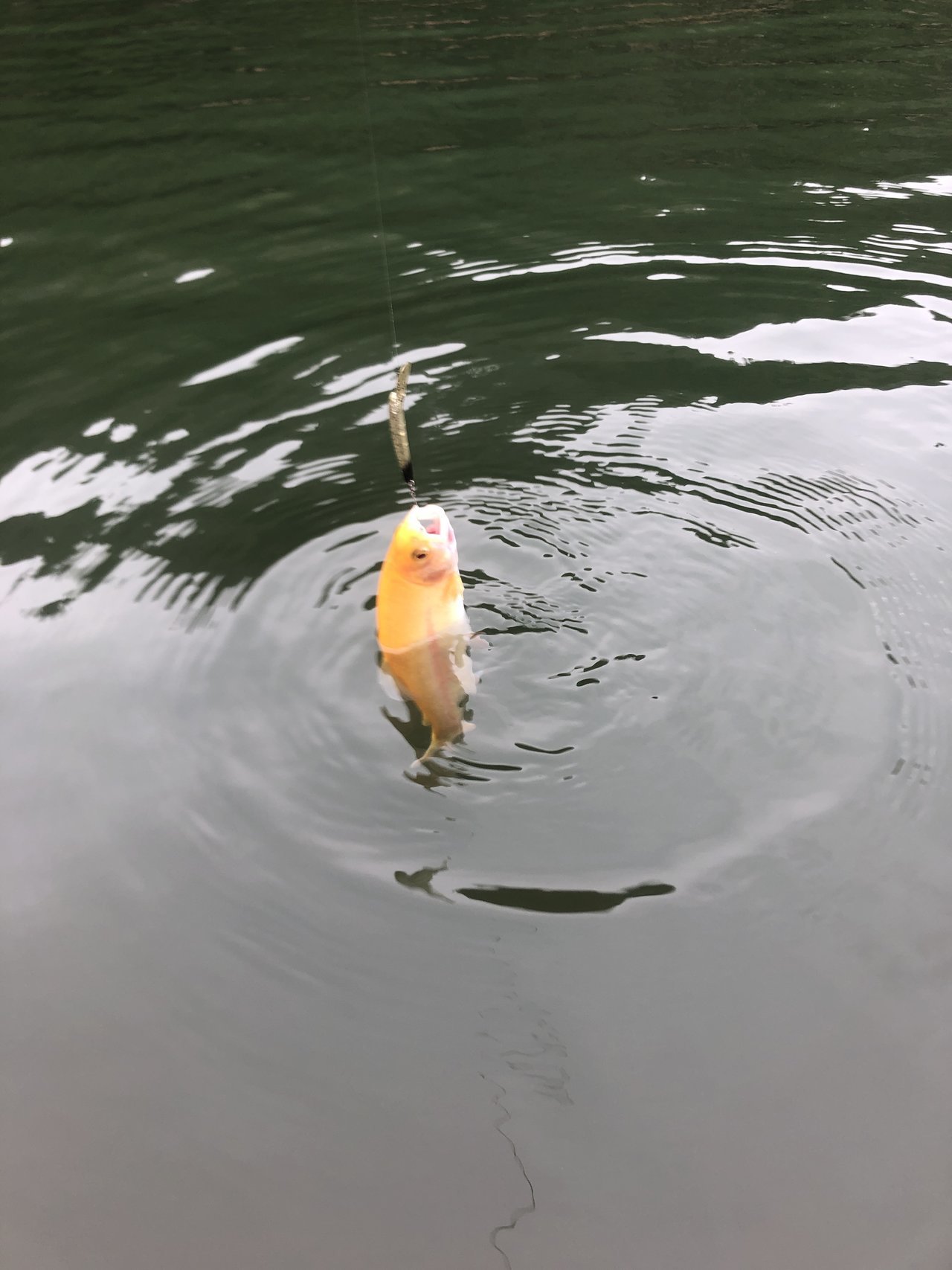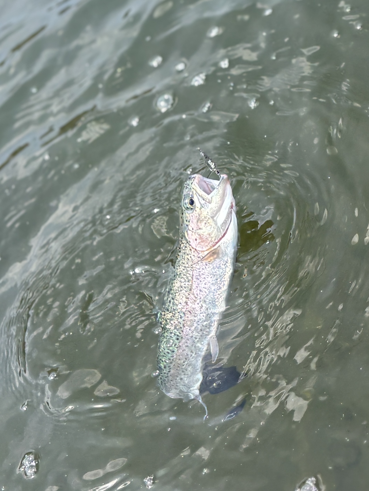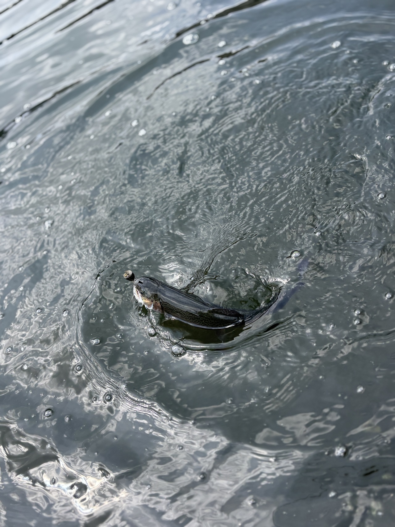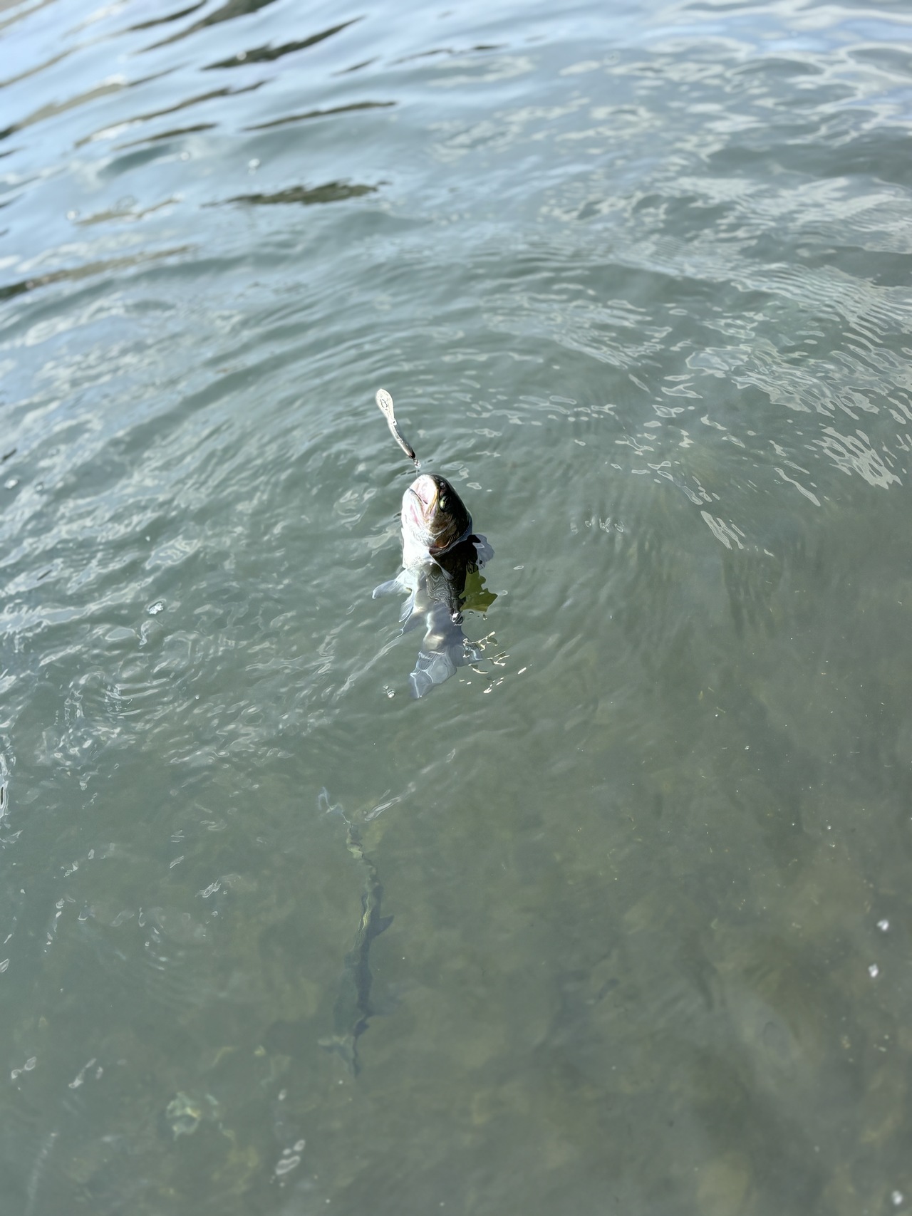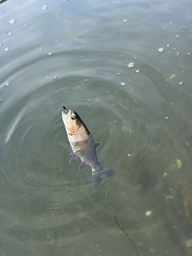 桟橋に入り、少しライズがあったので水面直下からスタート。1投目でニジマスをキャッチ。その後2匹ほど釣りましたが、後が続かず。ラインをシンキングに変えて釣りを再開すると、再びヒット。ニジマスがコンスタントに釣れます。