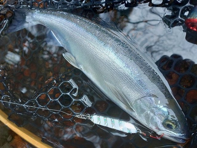 プロビアのフォール中にヒット!釣れたのは小型ですが綺麗な銀色の個体でした!