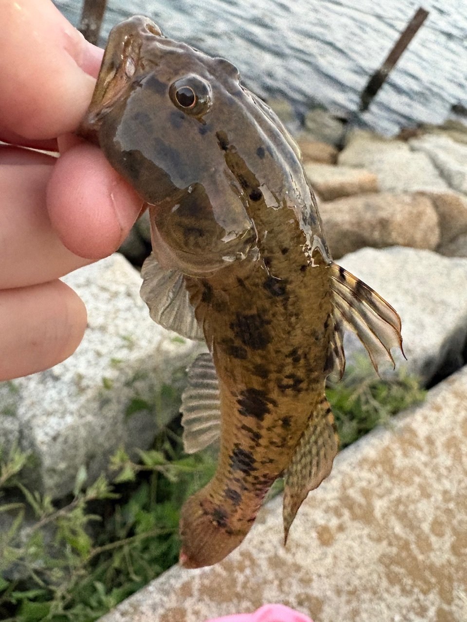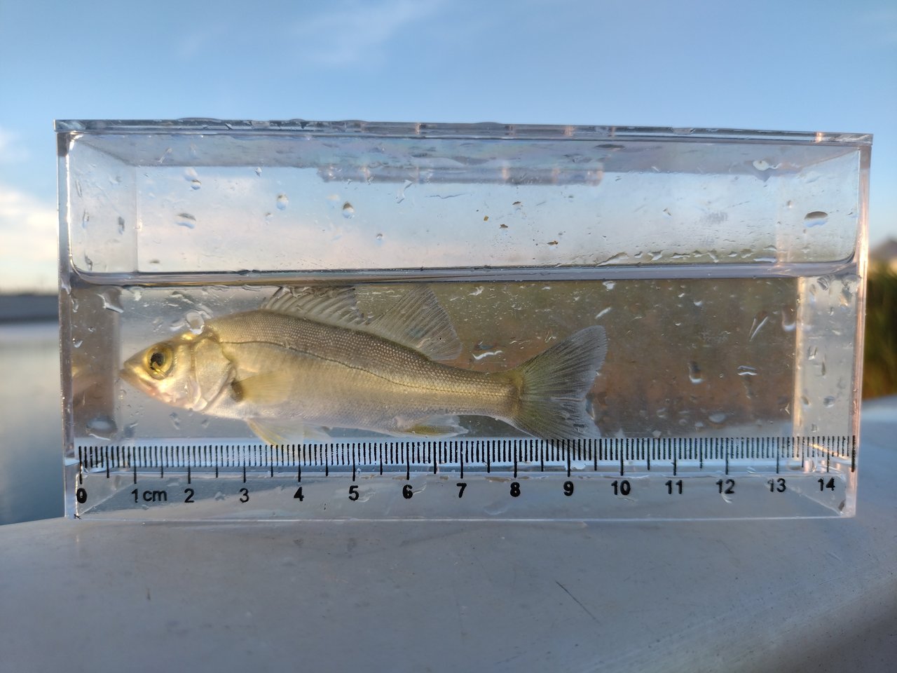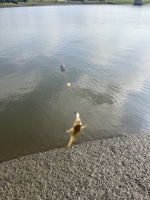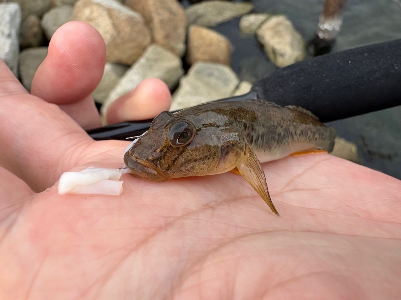 開始早々に良きアタリで13cmのハゼをゲット、連続で同サイズをゲット。ポイントを変えて探ると、ひったくるような大きなアタリ、釣れたのはスズキの赤ちゃんでした。