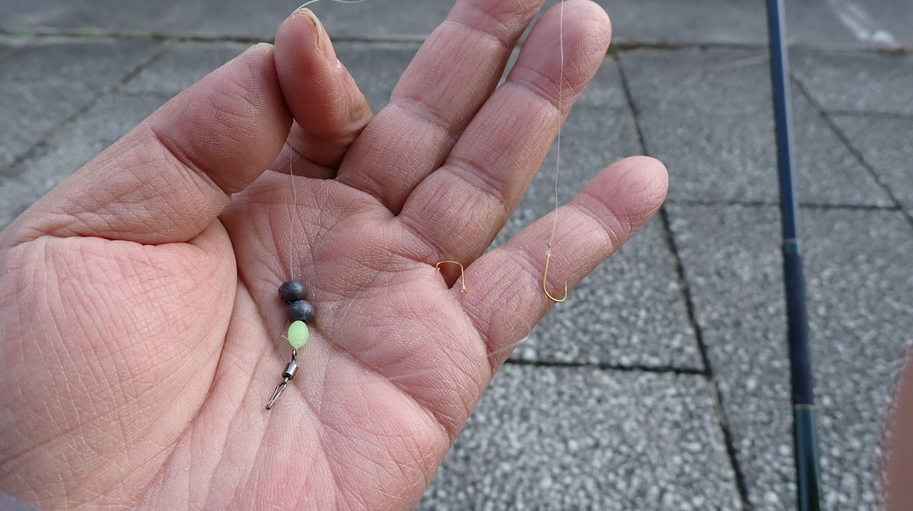 中通しオモリ0.5号、ハリ袖金6号、アオイソメエサ