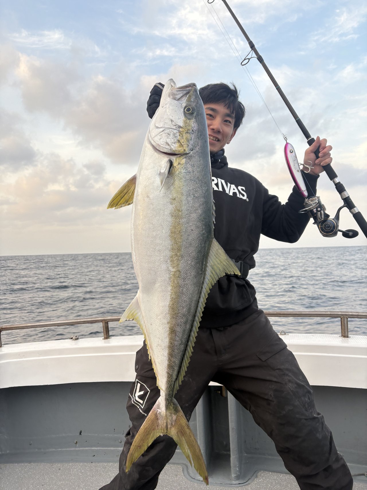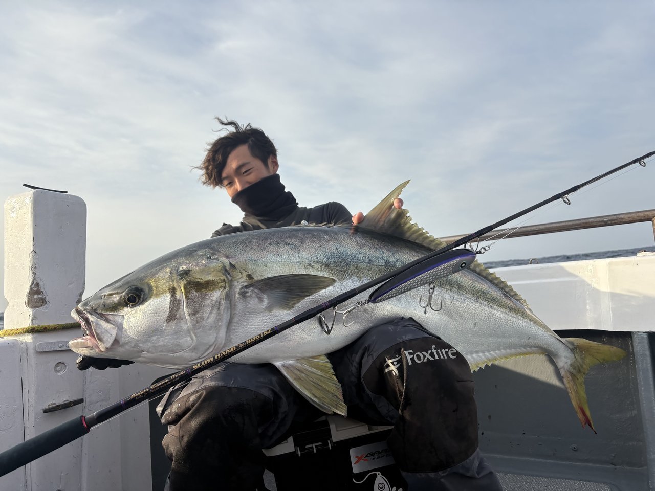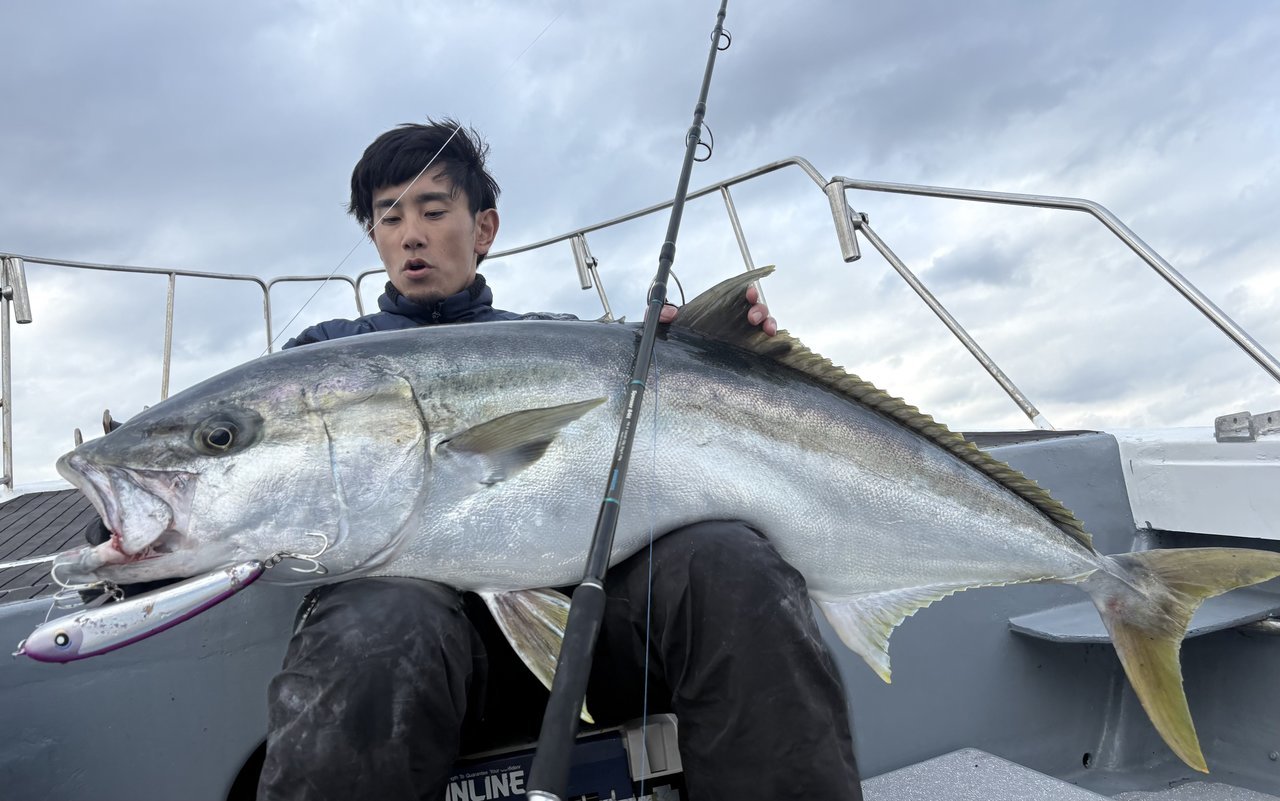 最初のポイントで同船者が1投目で14キロをキャッチと幸先のいい反応。しかし出るけど乗らないバイトが多く船中苦戦。その中CBONEのライアン230でヒット!9.5キロとまずまずのサイズをキャッチして一安心。その後、流しごとにルアーを変えるも出るけどノラない。ライアンに戻すとヒットみたいな調子で12キロ、13キロとサイズアップ。