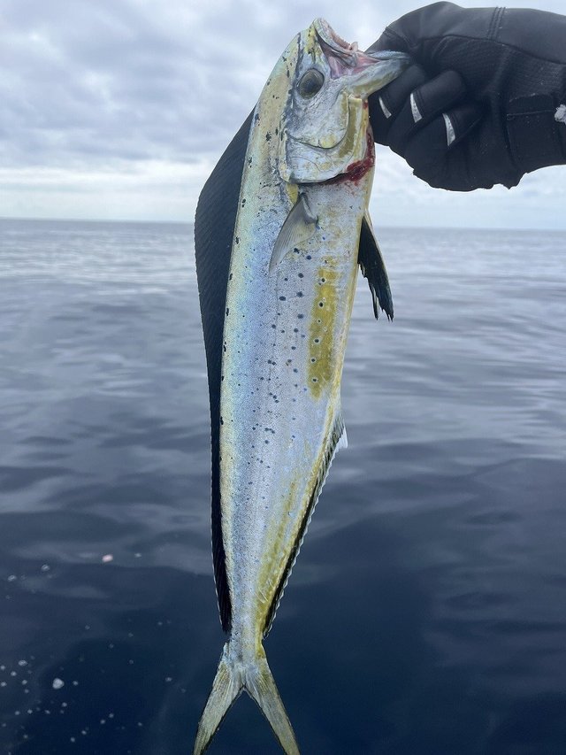 本命ポイントに到着し、魚探を見てみるととんでもない量の魚影で埋まっている!場所によっては下から上まで全部魚!いわきの海ってスゲー!これはもらった!と各ポイントでプラグ・ジグで攻めてみるも、反応なく...仕方ないのでTGベイトを落としてみると、カナガシラやサバなどのいつメンがコンスタントに釣れる。さらにはペンペンシイラの大群に襲われ、二進も三進もいかない状況に。