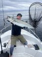ヒラマサポイントに到着。高実績ポイントを攻めてみるが、不発。天気も雨模様になり、皆気持ちが沈みかける。最後にやや離れたポイントに移動し、チョイスしたのはジギング。そこでスイムライダーを投入し、シャクると...何かがじゃれて来ている!!落とし直し、着底直前でしゃくりなおすとガツンとHIT!子気味良い引きで上がってきたのはヒラマサ!これで船内が一気に活気づき、再びジグを落とす。着底してすぐ早巻きすると、しゃくり始める直前にゴッ!!本日初ドラグが出る!上がってきたのはなんとサワラ!体高があり、1mはあろうかというくらいのグッドサイズ!良い引きを楽しめました。