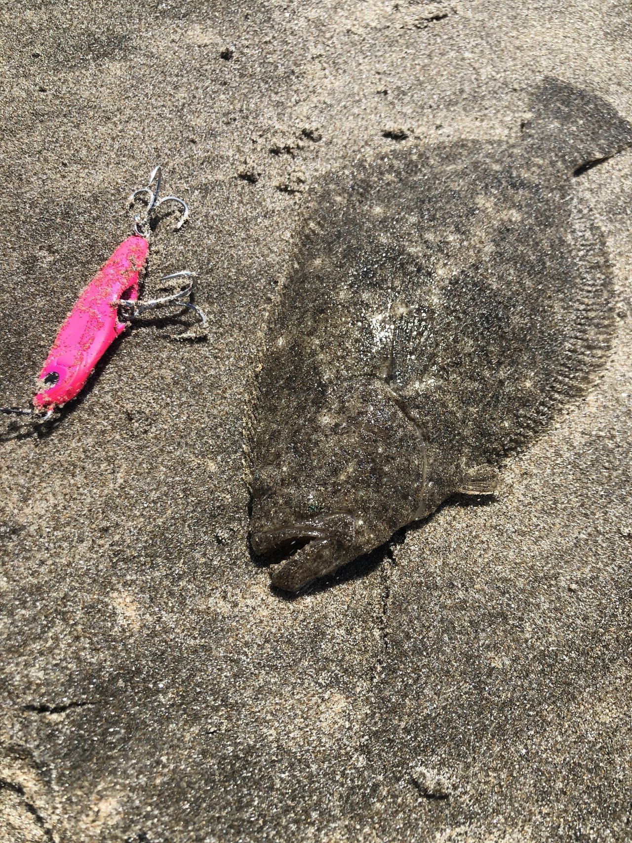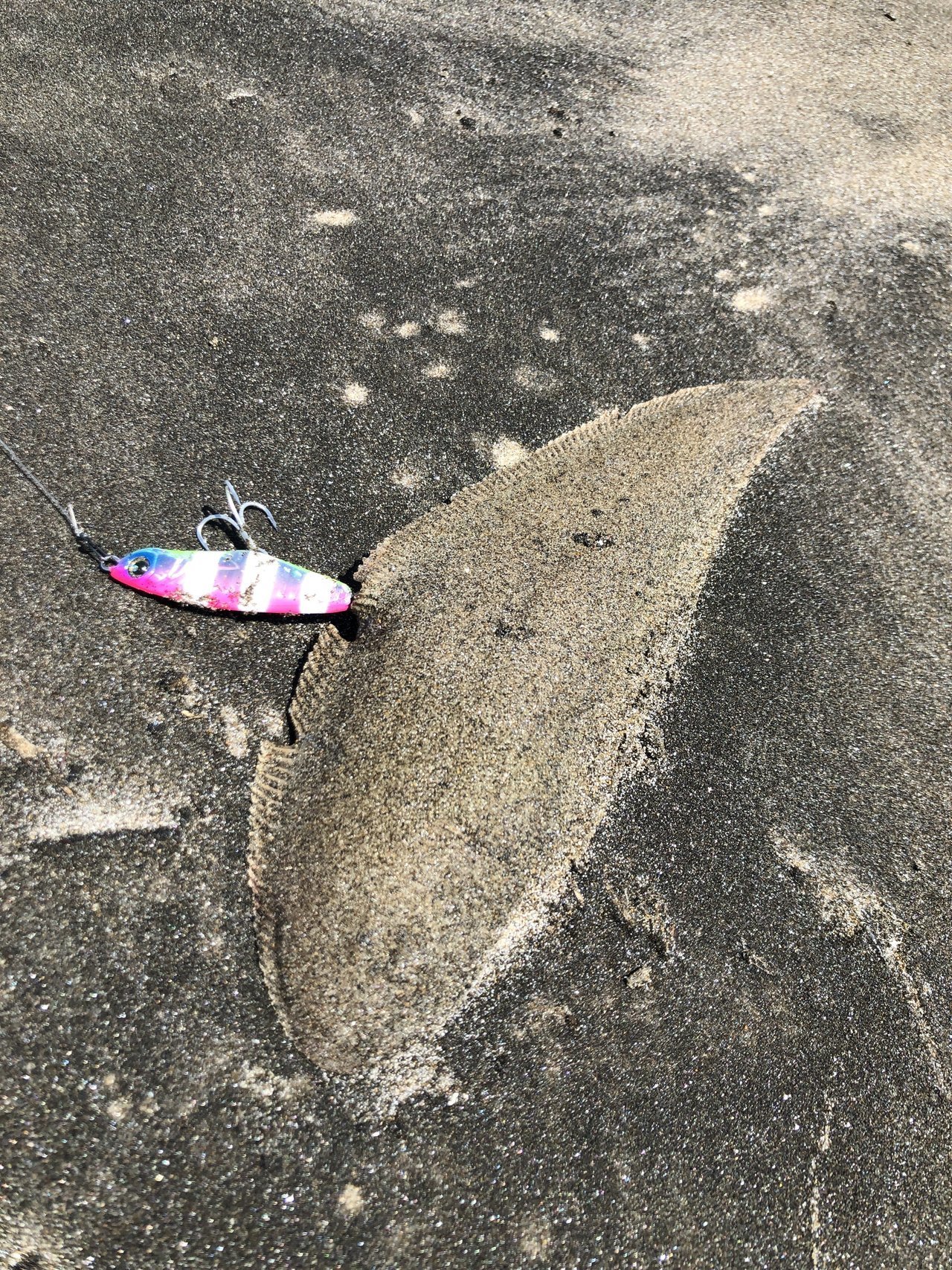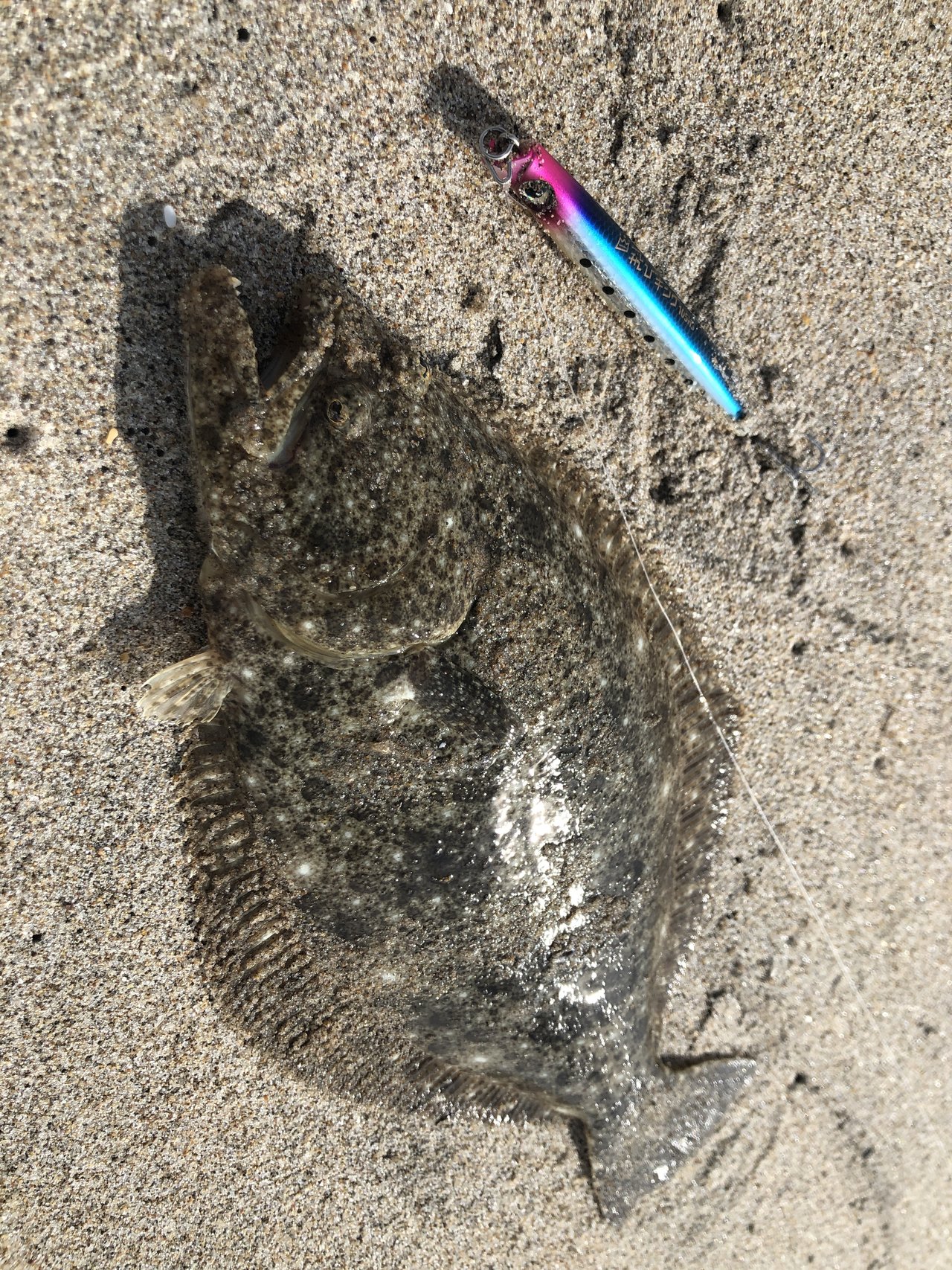 これはマズイという事で県南サーフに逃げることに。風は強いものの追い風で、ジグがどこまでも飛んでいきます。浜の砂が舞い上がる中「ストームブレーカー44g」を遠投するとようやくアタリが!ソゲでしたが強風の辛い状況で釣れたのでほっこり!この後、シタビラメを一枚釣っていったん終了。