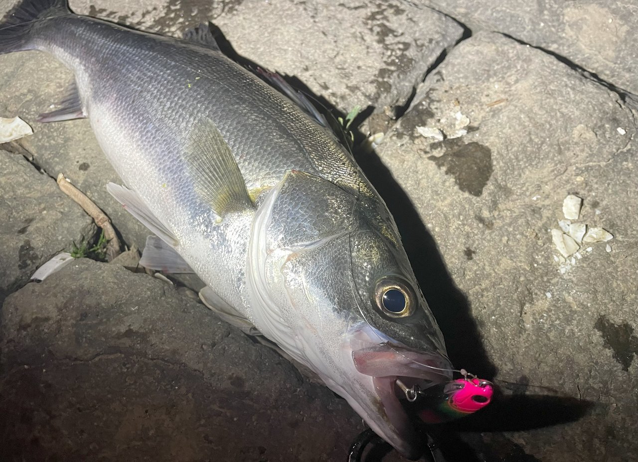 「サムライジグTG30g」でストップ&ゴー、まずまずサイズのマゴチが釣れました!前半が厳しかったので一安心ですね^^この後も「SGスイマー28g&アルカリシャッド」を投げているとシーバスHIT、嬉しいゲストを釣って収竿としました。