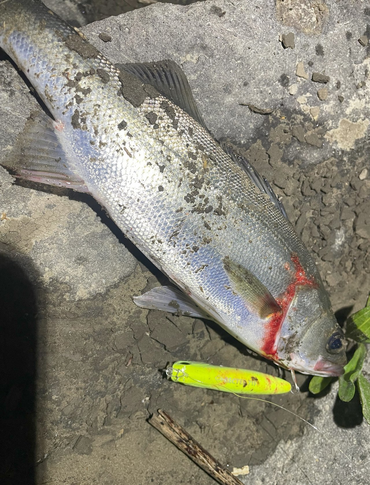 こんにちは!泉バイパス店スタッフ佐藤です!今回はロンジン様御一行とシーバス狙いに行って来ましたよ~!!明るいうちはロンジン『ストームブレーカー28g』の遠投で沖のボイルを狙ってみるがボイルの数少なくシーバスからのバイトが少ない、でもさすがロンジンチーム!!しっかりヒラメを釣り!暗くなってきたのでロンジン『レビンミニ12g』に変更し、流れが強くなっていくの待ちながら攻めている沖で良い個体がヒットですがエラ洗いで痛恨のバラシ…。そしてすぐロンジンチームが良いシーバスをキャッチ!!そして私も50くらいですがなんとかキャッチ!レビンミニ『ブラックキャンディー』やたら効きますよ!!また行って来ます。