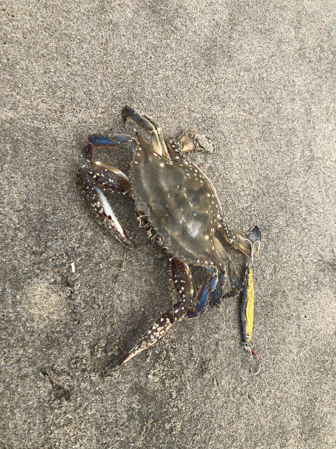 二か所目はアタリ無し。嫌な予感を感じますが、三か所目にてようやく流れが強く効いているポイントを発見!!ジグやシンペンをゆったり巻いて、たまにリフトフォールさせていると、小さいながらもヒラメにマゴチ&特大サイズのワタリガニも釣って納竿としました。