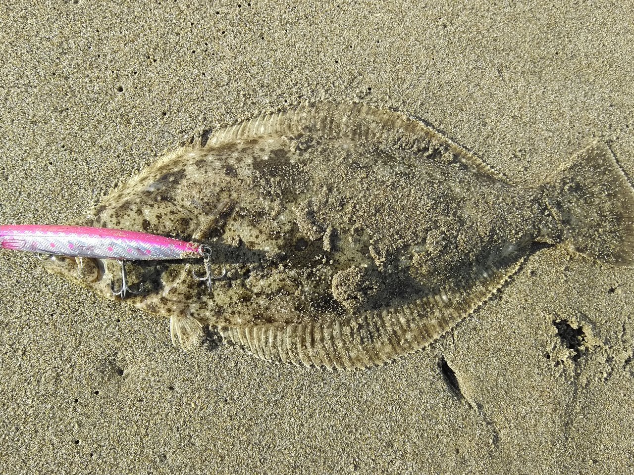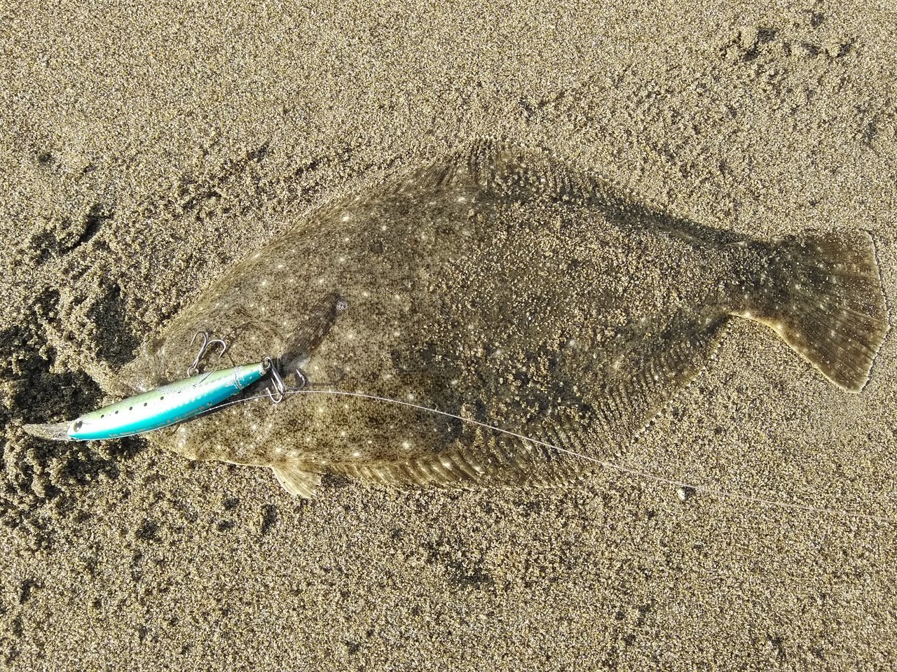 こんにちは泉バイパス店石川です!お昼過ぎの13時にサーフインしました。開始すること数投目に手前でHIT!45cmのヒラメさんでした(^^)続けて連続HIT!!サイズダウンのヒラメさんでした!それからはしばらくノーバイト(><)夕マズメにオフベイトで肉厚なカレイを追加して納竿となりました。引き続きサーフ好調のようです。