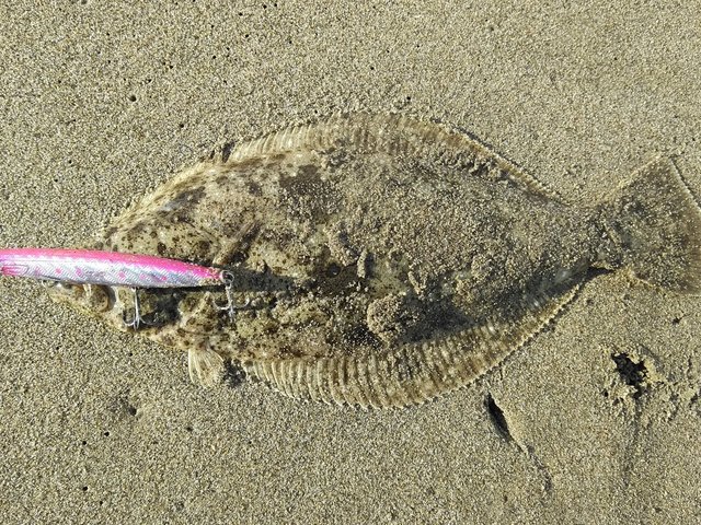 こんにちは泉バイパス店石川です!朝6時半からのスタートです。先ずは手前をミノーで通しましたがアタリ無し(><)ランガンしながらポイントを見ましたが地形があまり良くなく、最初のポイントで粘る作戦です。ミノー・ワーム・ジグをローテーションしましたがノーバイト(><)結局釣れたヒラメは全てシンペンでした(^^)やや濁りがありましたのでピンク系やキャンディーが入ったルアーが良かったようです。その日によってヒットルアーが違うのもルアーフィッシングの楽しいところだと思います。