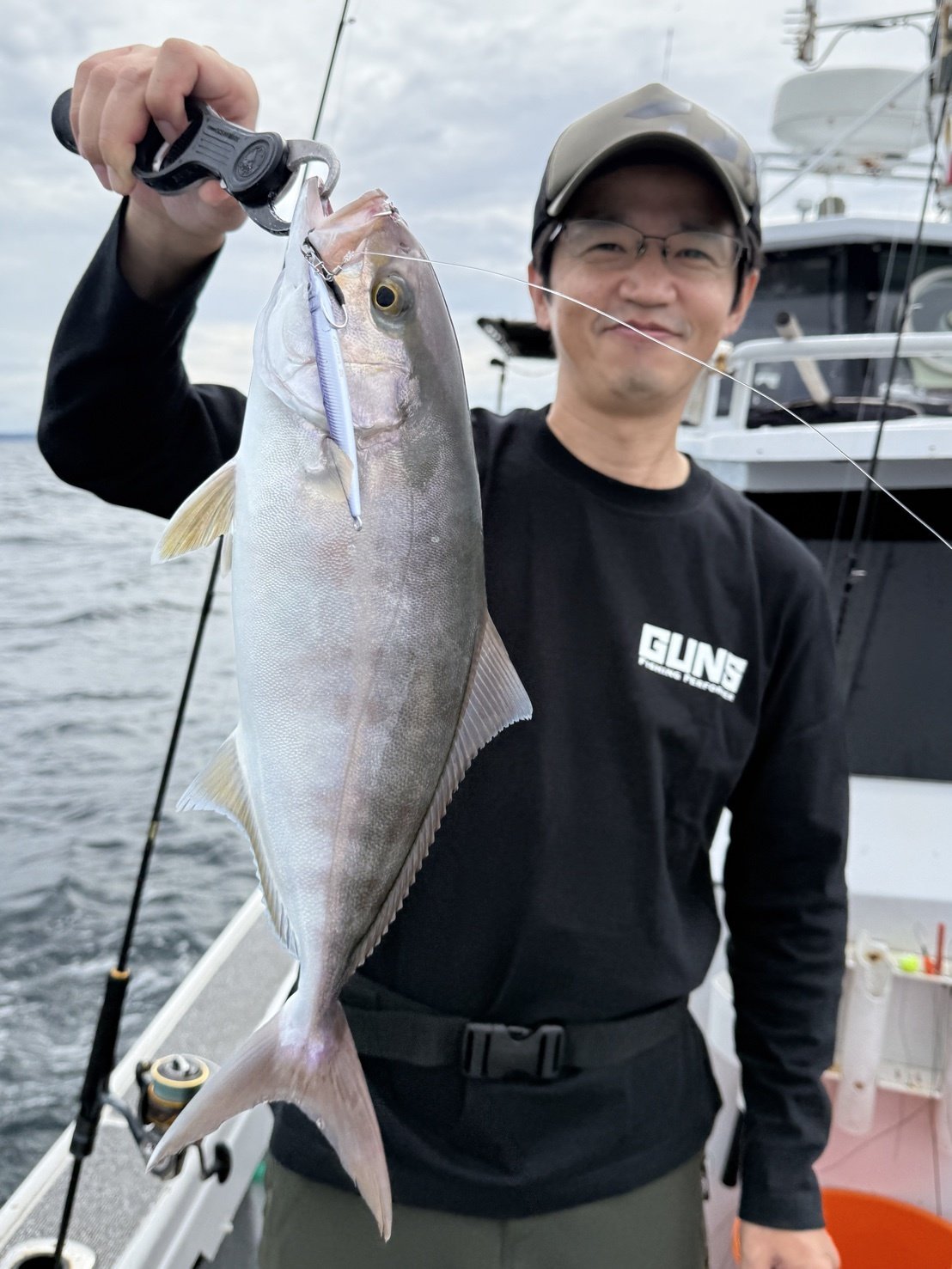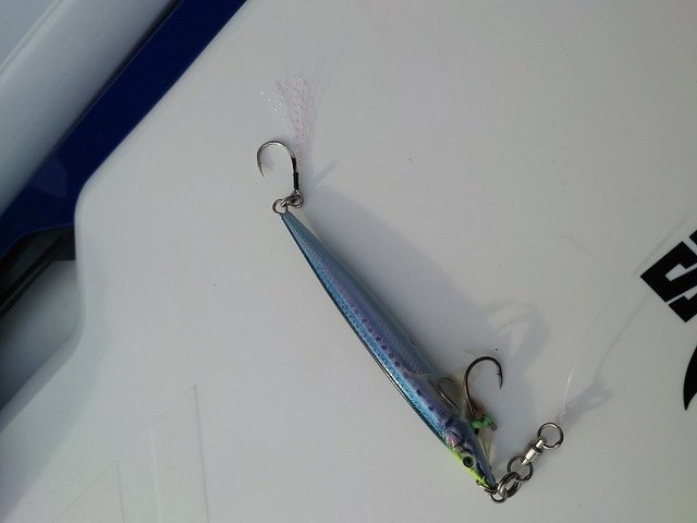 ヒラマサポイントに到着。高実績ポイントを攻めてみるが、不発。天気も雨模様になり、皆気持ちが沈みかける。最後にやや離れたポイントに移動し、チョイスしたのはジギング。そこでスイムライダーを投入し、シャクると...何かがじゃれて来ている!!落とし直し、着底直前でしゃくりなおすとガツンとHIT!子気味良い引きで上がってきたのはヒラマサ!これで船内が一気に活気づき、再びジグを落とす。着底してすぐ早巻きすると、しゃくり始める直前にゴッ!!本日初ドラグが出る!上がってきたのはなんとサワラ!体高があり、1mはあろうかというくらいのグッドサイズ!良い引きを楽しめました。