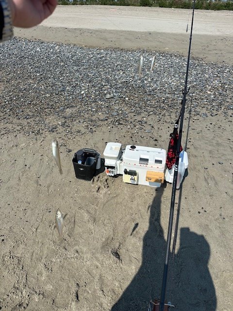 という事で遠投は諦め1色以内を攻めることに。そろそろ回収しないと仕掛が絡まる0.2色ぐらいで強烈なアタリ。上がってきたのは18cmと21cmのシロギスのダブル!。そんなところに居たのか~。しかし、そんなには続かず、結局足で探ることになりました。海岸の端から端まで探りましたが雷がなり始めた昼頃までに18cm~21cmを9匹揃える事ができました。数は少ないですが、型が良かったので良しとします。
