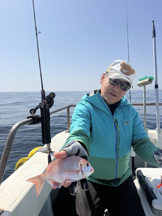 それでも船中ポツポツと50から60cmサイズがちらほら上がり始め、時合いを掴んだ石橋さんが50cmオーバーの真鯛をまずは1枚!わたしは良型のアオナ😇