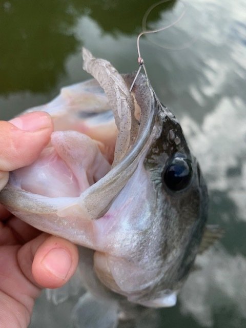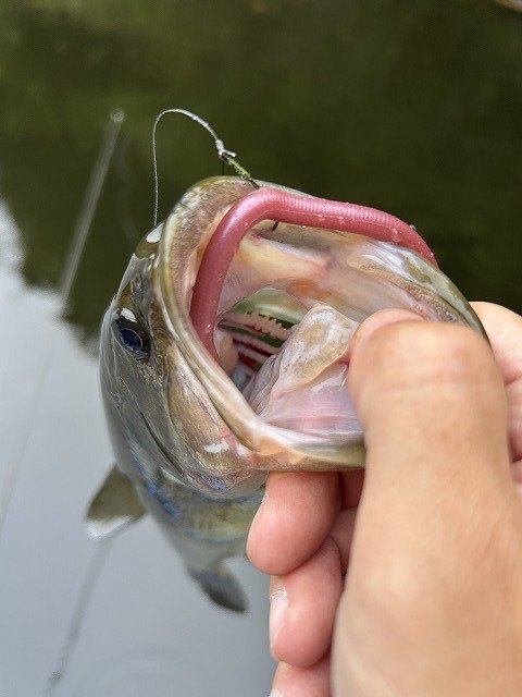 そこで一度クランクを通した杭にカットテールのネコリグを投げてみると可愛らしいバスがHIT!