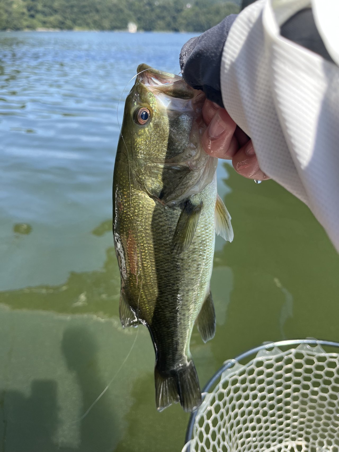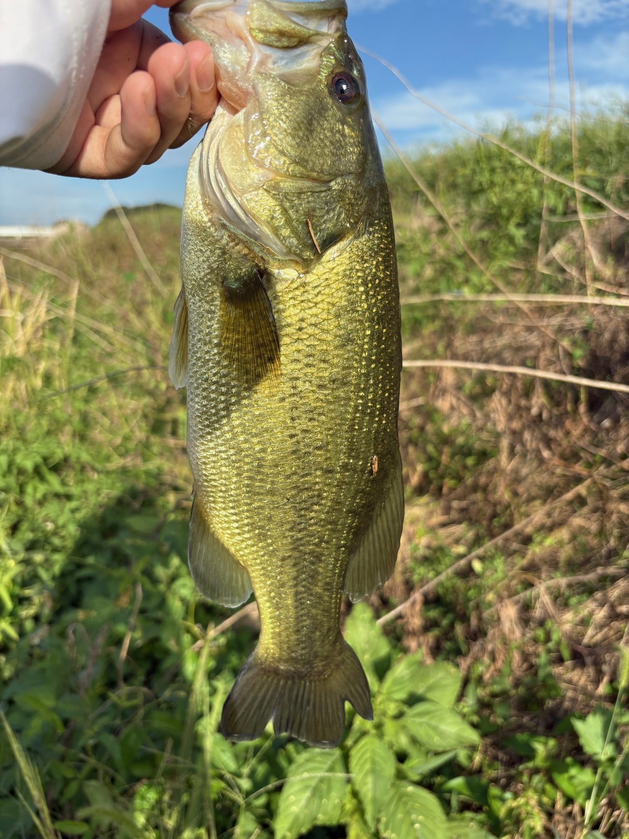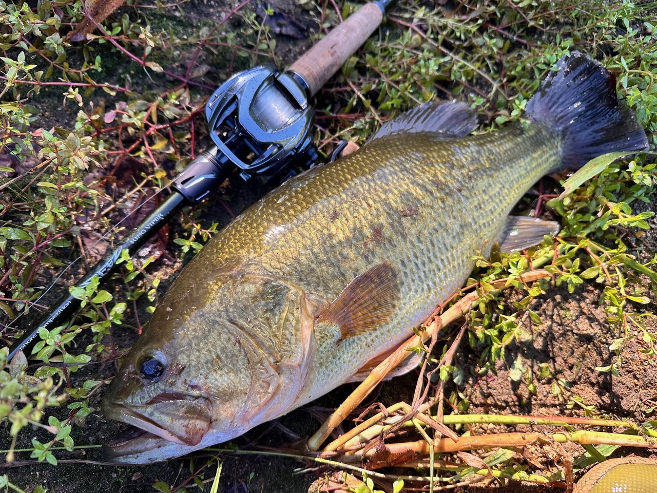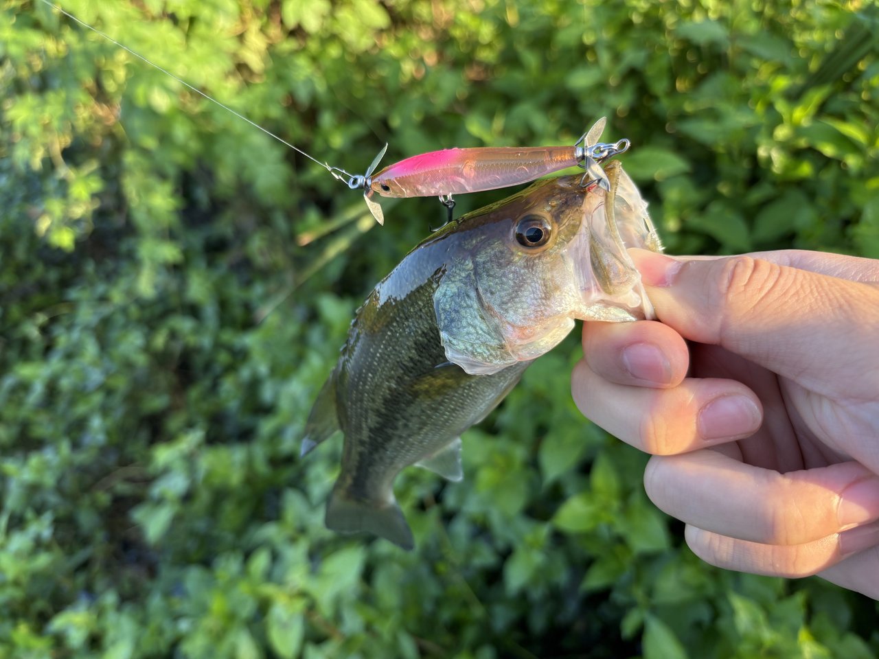 直後に下流から泳いで来たバスの進行方向にキャストし、逃がしを入れるとこれも簡単にバイト!