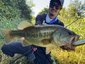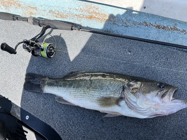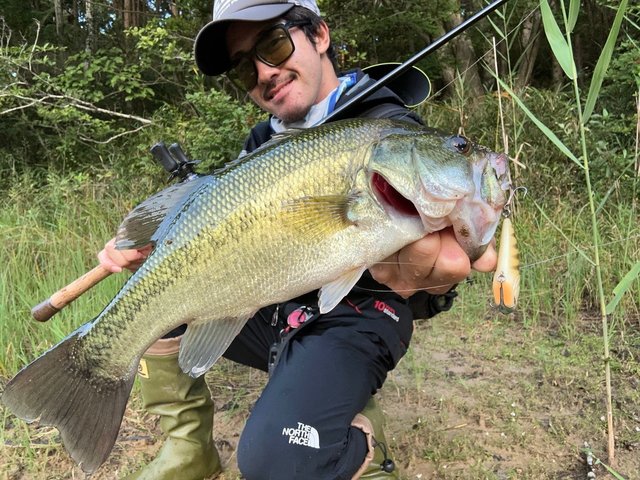 僕はトップウォーターで友人はジグストからスタートしてブッシュの下や岩盤付近を探っていくことに、すると岩盤近くにルアーを落とすとほぼ着水同時に水面を爆発する猛烈なバイト!!魚の重さが乗ったのを確認してフッキングするとロッドがバットから曲がり、リールが全く巻けないものすごい引きでバレないことを祈りながらがむしゃらにファイト!!何度かものすごい魚の突っ込みに堪えて友人がランディングネットで魚を掬ってくれてサイズを確認すると超ビックサイズのブラックバスでした。