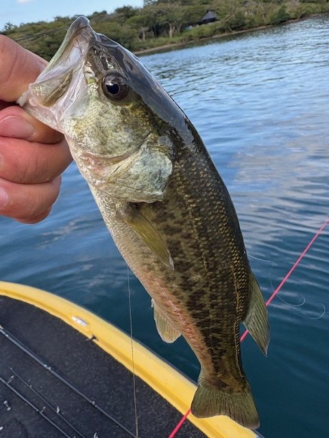 水深3~5mくらいのウィードが絡むところを流していくと早川沖で小型ながらスモラバにてファーストバスをゲット!