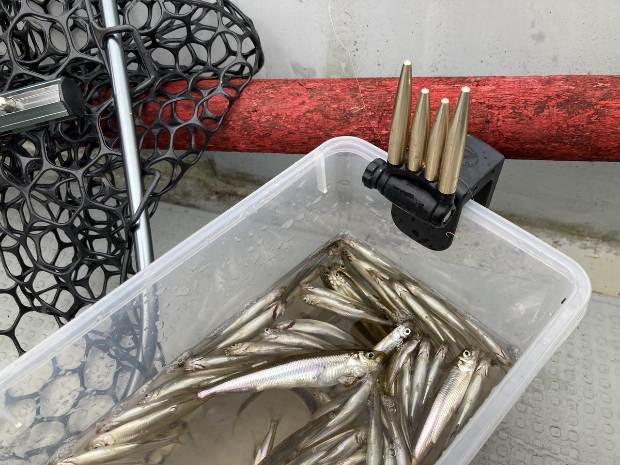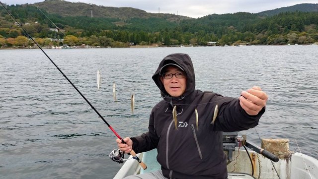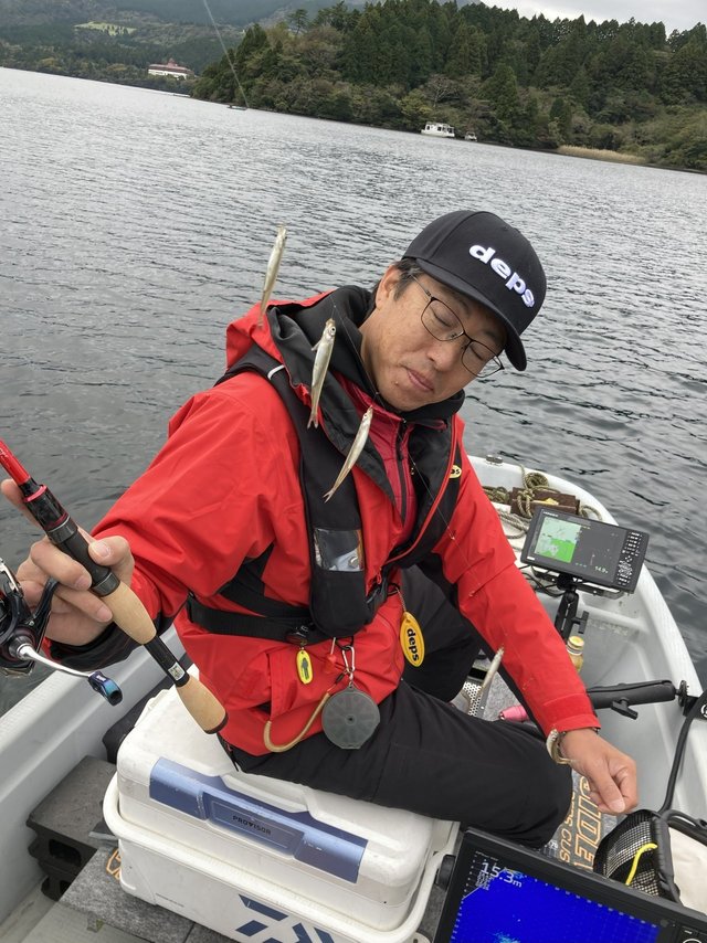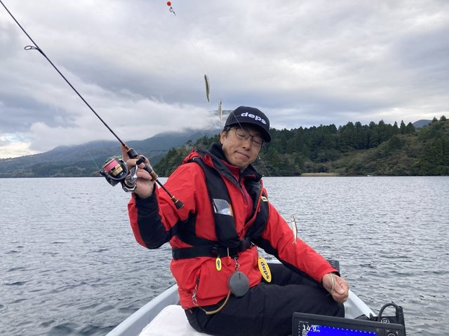 毎年恒例の芦ノ湖のワカサギ釣りに行ってきました。高橋船長のお世話になりライブスコープを駆使し魚探の反応を追いかけながら釣る流し釣りで挑戦。仕掛けはオーナースーパーパニック2.5号でエサなしの空針で狙います。魚探に出た反応に仕掛けを入れて誘うとポツンポツンと当たりありました。ボトムより中層の反応の方が活性が良いようでした。いい反応当たると10点掛けなどもでき楽しめましたよ。レイクジギングもやりたかったのですが、天気が悪かったので断念。近場でライブベイトをやったところブラックバスが1匹GETできました。ワカサギは二人で1.3kgと大漁でした。今季も好調に釣れていますのでぜひチャレンジしてみてください。また芦ノ湖はこの時期は思ったより寒いことがあるので防寒の準備もしてお出かけください。