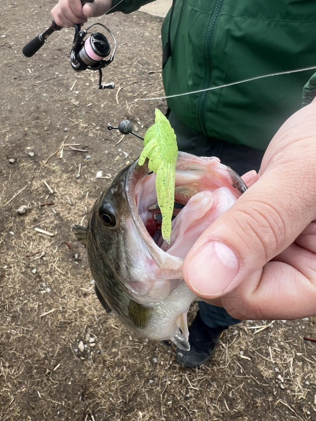 すると1投目から反応が!フッキングすると25cmぐらいのバスがヒット!