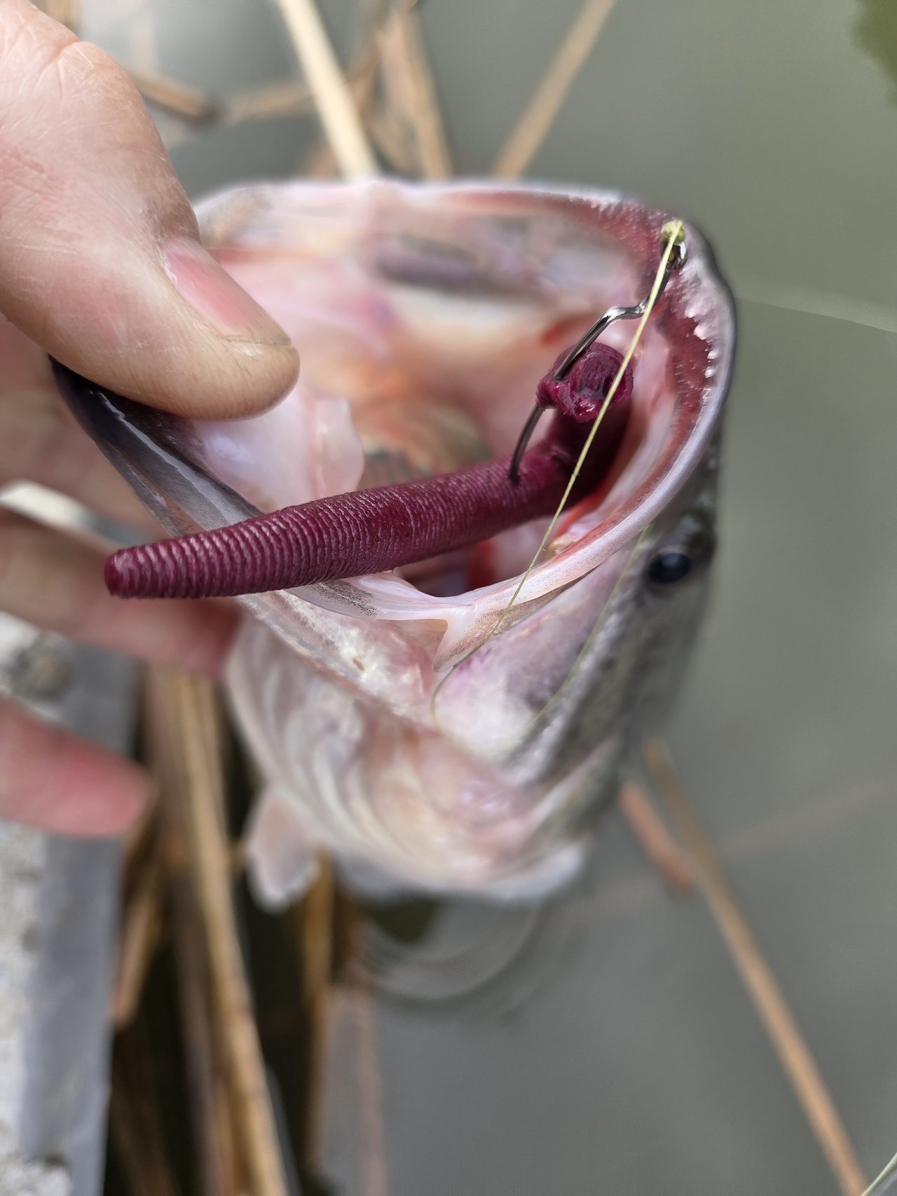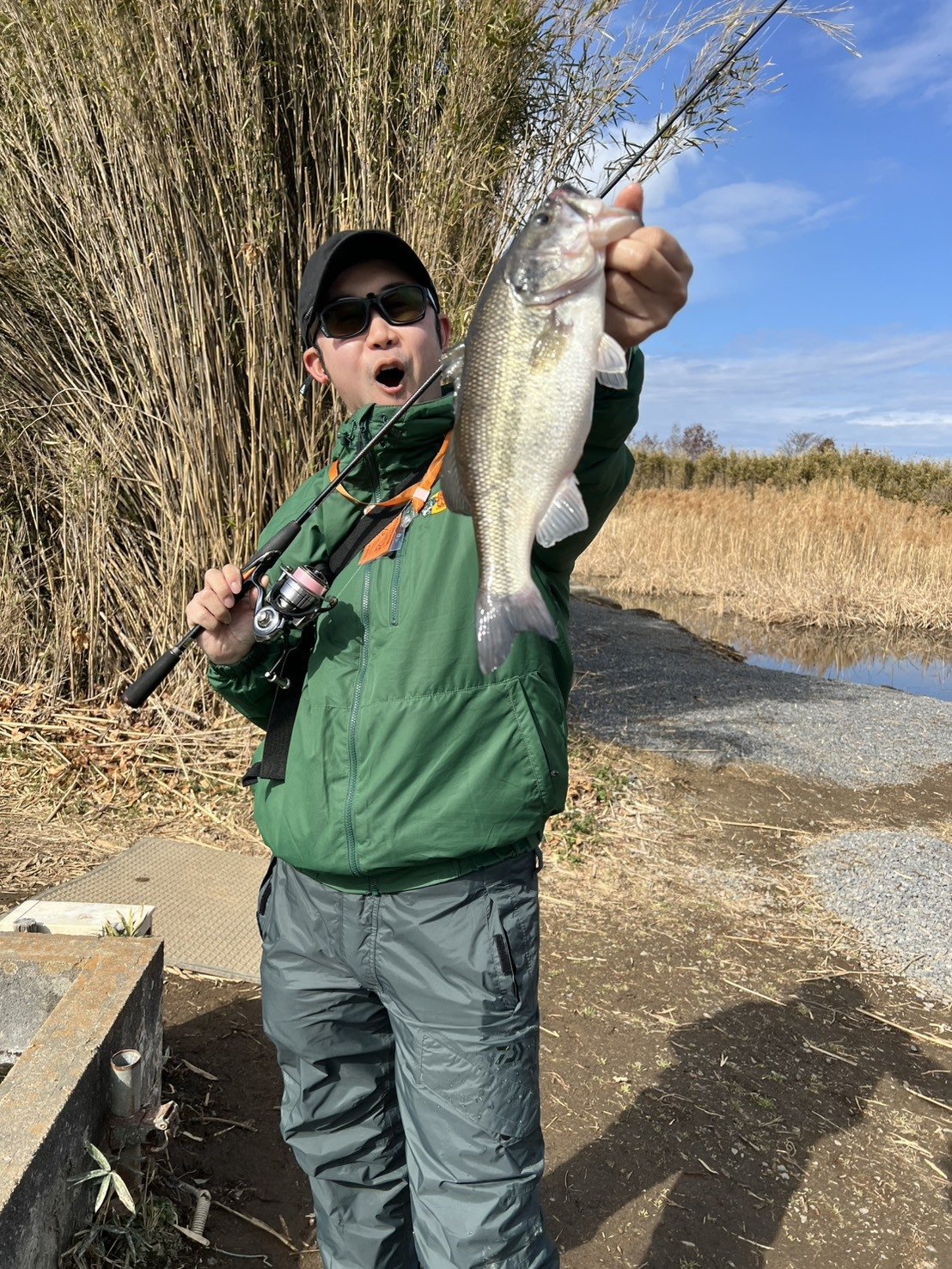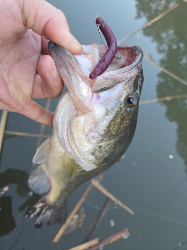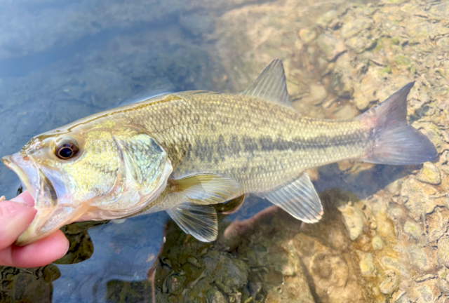 前回の反省から水深、流れのある所、シェードなどのオープン気味な場所を集中して釣り10匹以上釣る事が出来ました。養殖バスだからか、シャローカバーに入る際に葦、ガマなどを揺らす時がありかわいい。