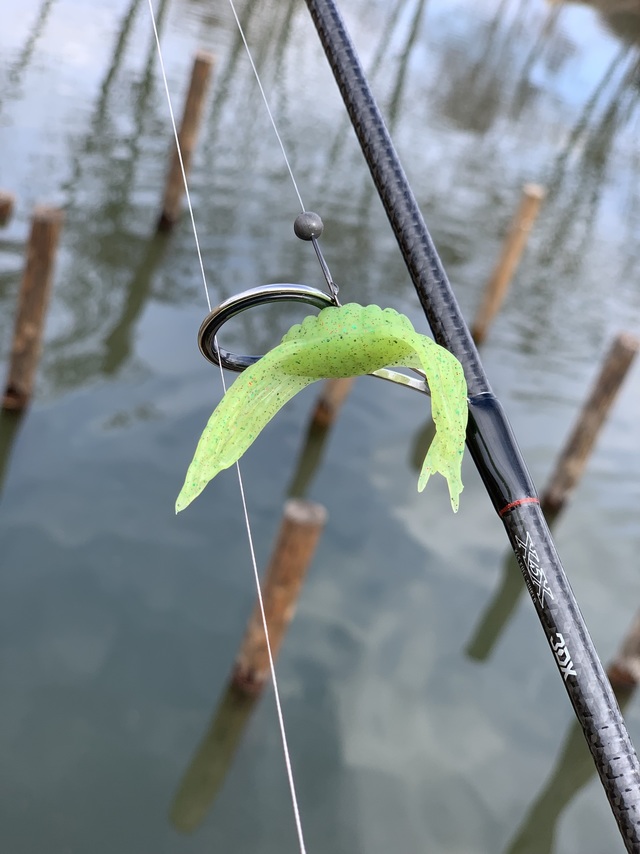 そのあとは【reins】ソルトワームや【ボトムアップ】“HurryShrimp(ハリーシュリンプ)3.0インチ”に1.8gのDSで連発!