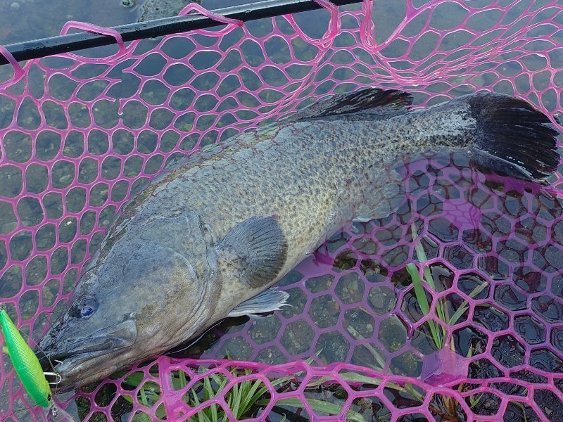 反応が無いので手前のカバー際にキャストするとラインが走ってる!合わせると確かな生命感ながら弱めの抵抗、軽く抜き上げ小さめの25cm程ながらまあ幸先の良い感じです。