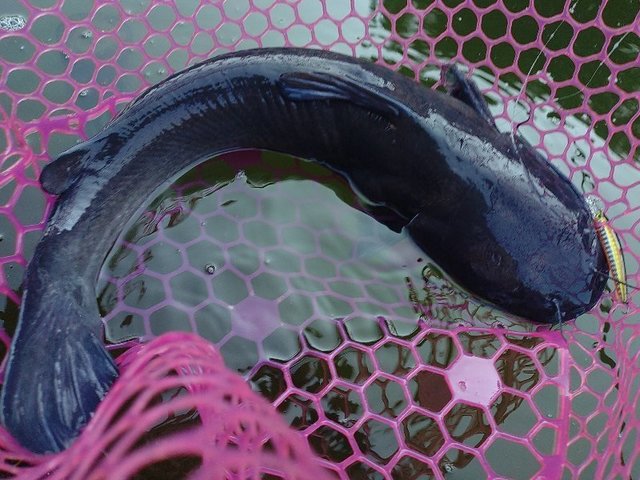 上がってきたのは黒いニョロニョロ……キャットフィッシュ(アメリカナマズ)をキャッチです。
