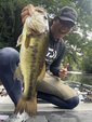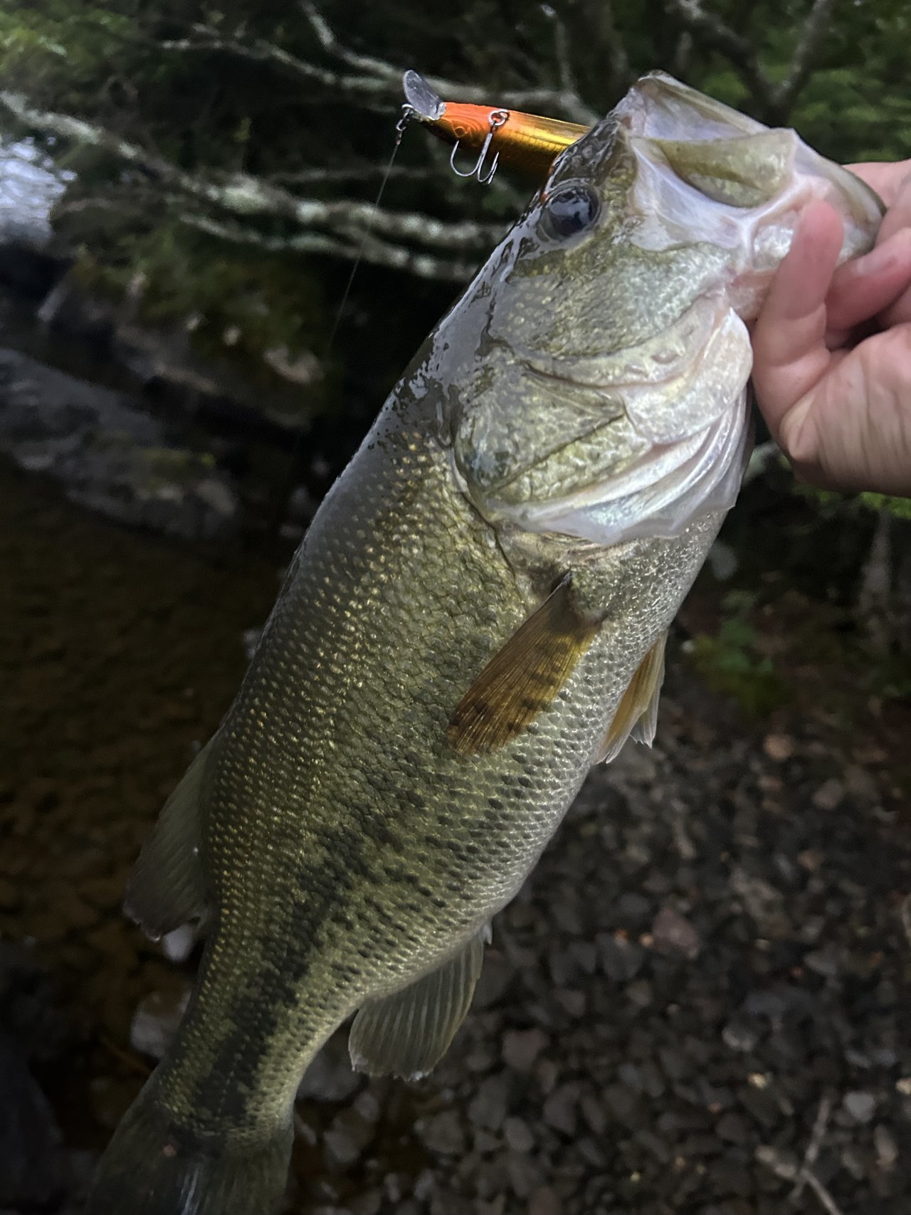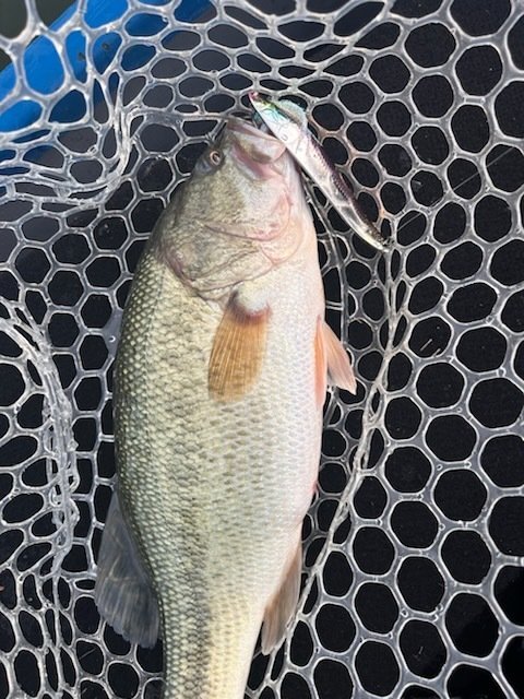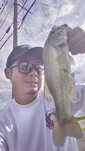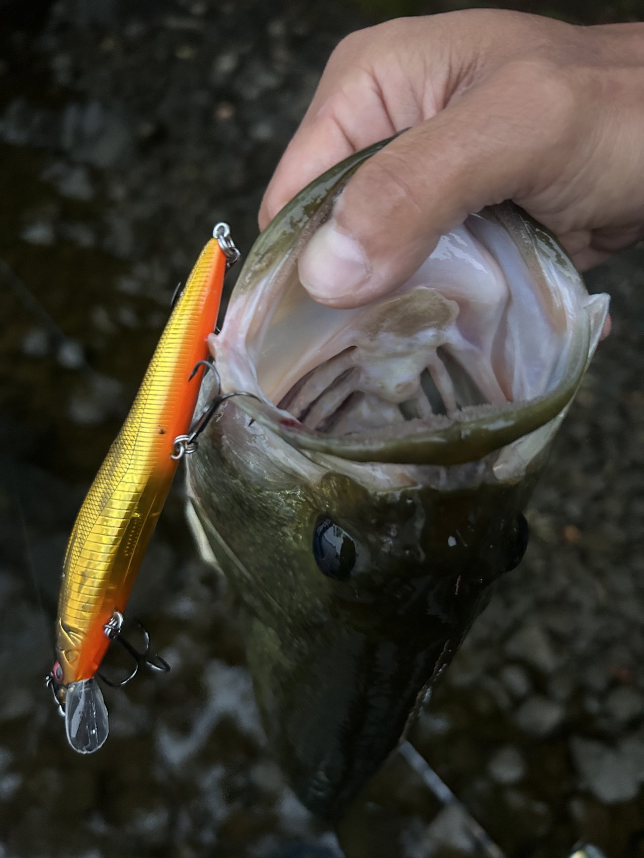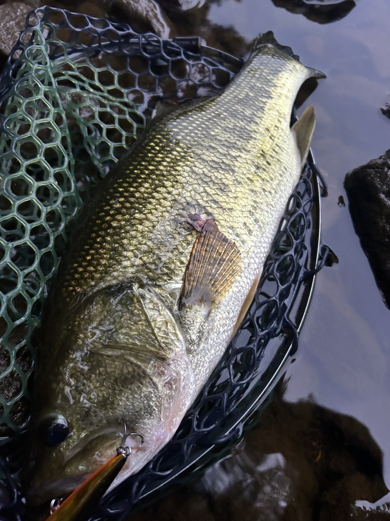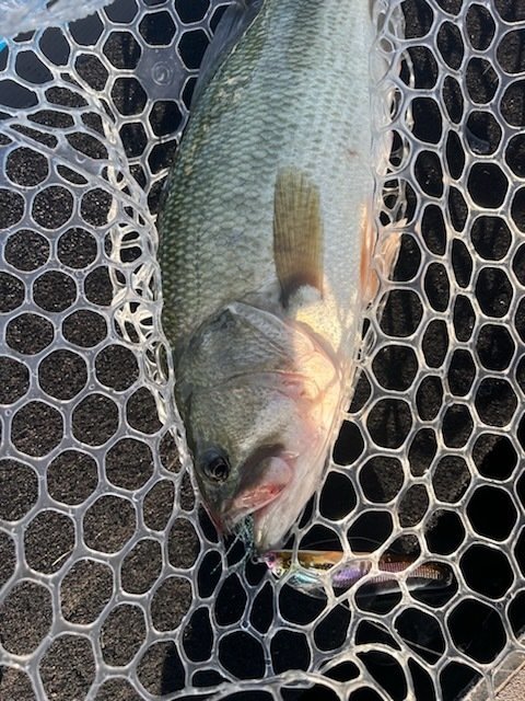 新場所を散策しバイトはあるもののフッキングがうまくいかず、17~18時のマズメ時に雨が降ったので、流れが出来るポイントに入り、スクーパーフロッグダディのジグストでラインが引っ張られしっかり喰い込ませHIT!