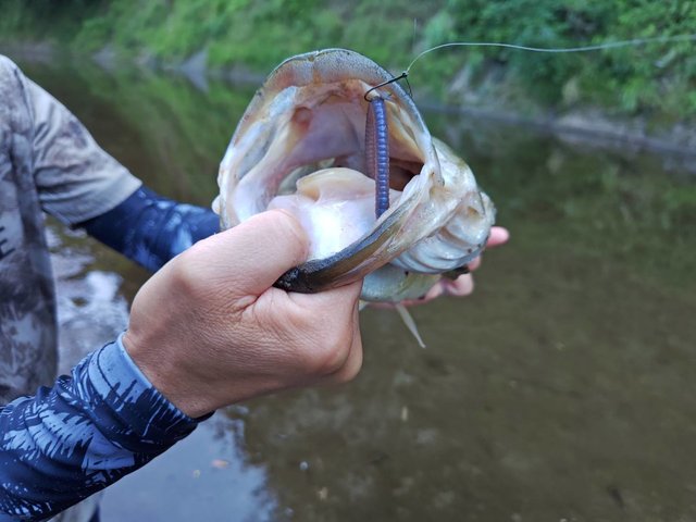 カバー狙い放題です!ギル、オイカワが多く見られました!石井釣舟店の筋の川の上流まで行くもなかなか釣れず。本湖に戻りながらギルワームのフリーリグに待望のバイト!小さいサイズですが久し振りの三島バス!