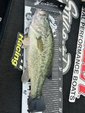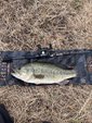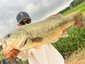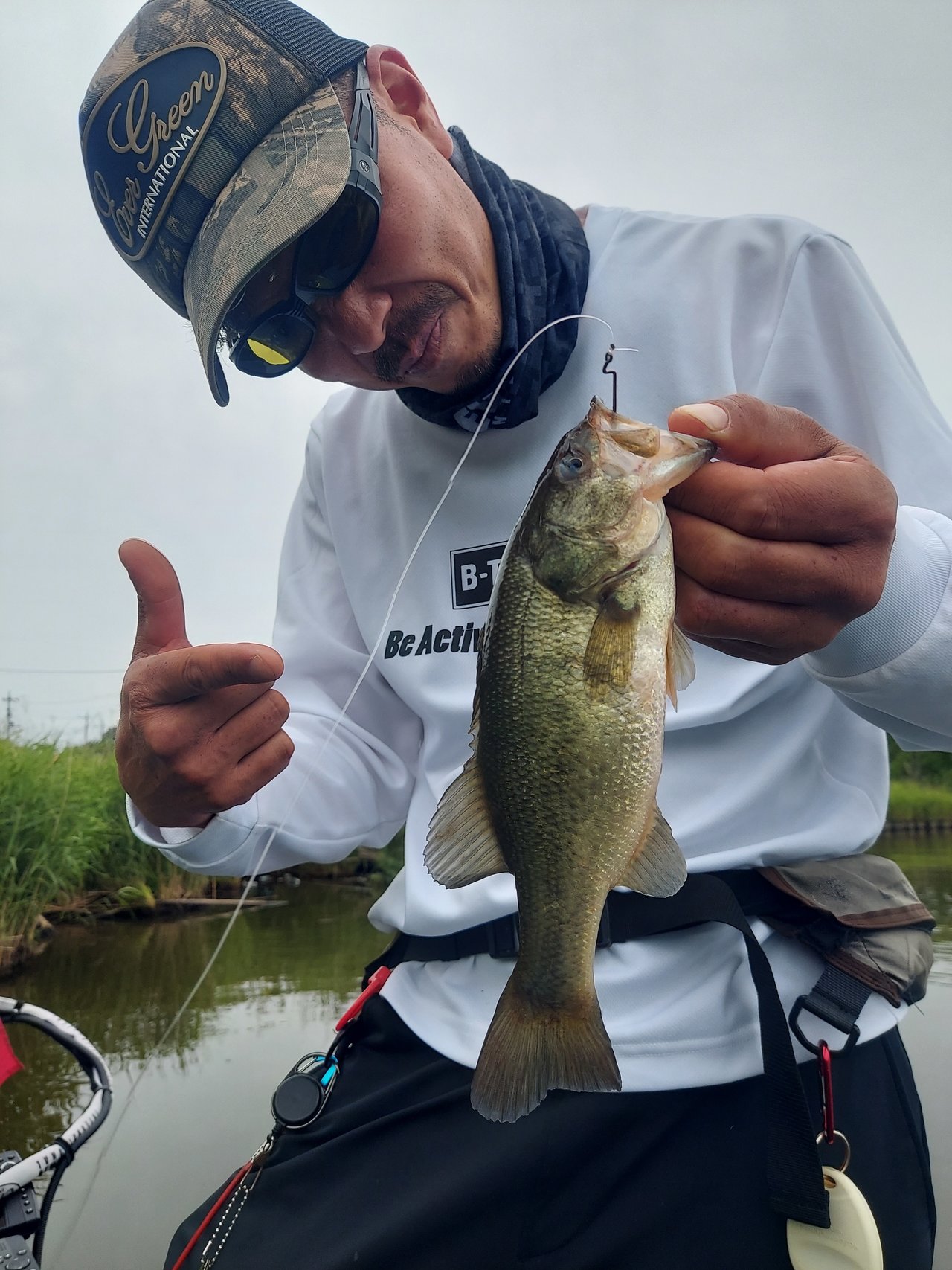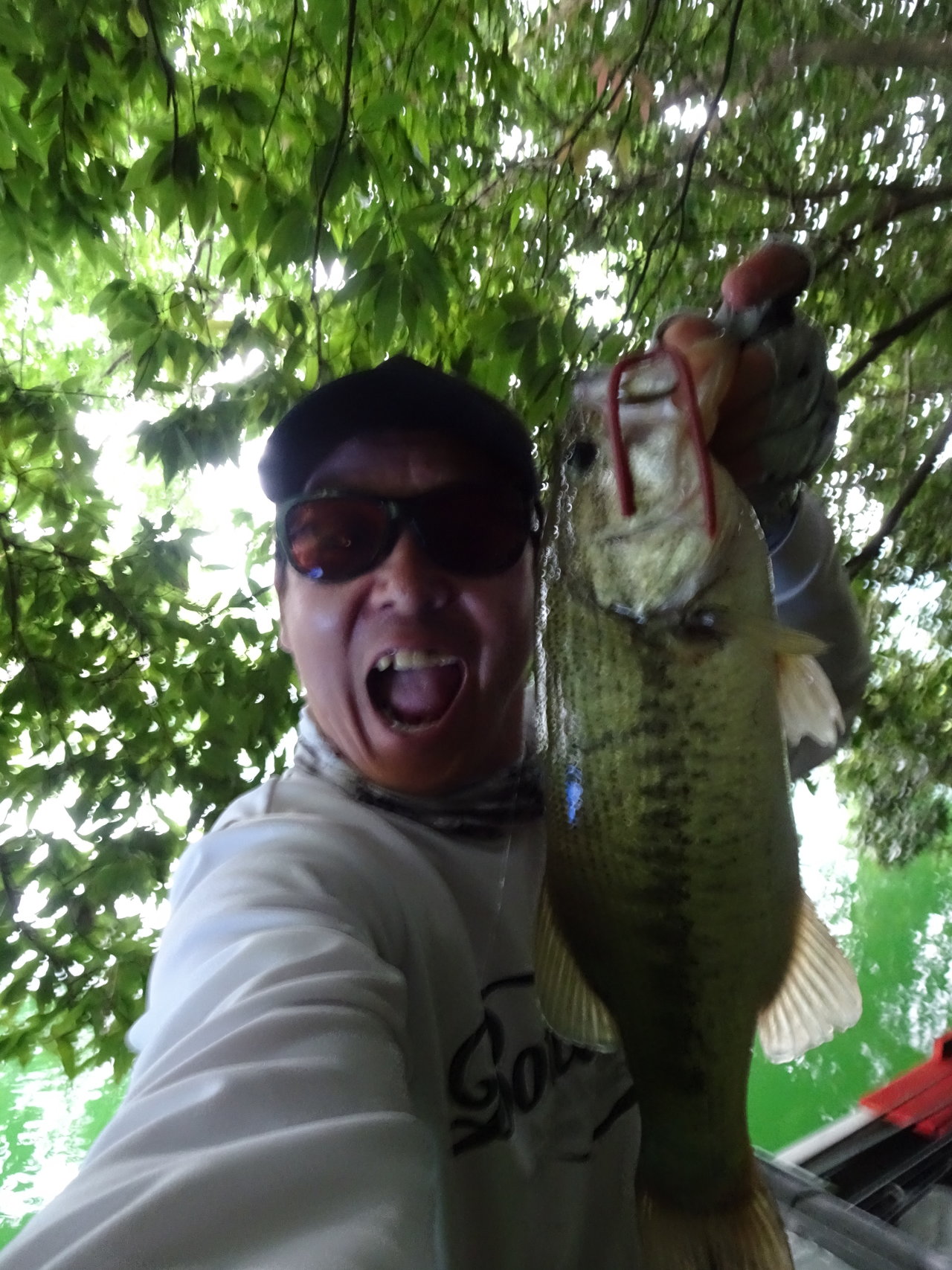 その後さらに下りながら探っていくとひっくり返っているボートが目に入り、気になったのでギミー4.5インチをキャスト、フォールしていると・・・『グン!?』まさかのバイトがあったので思いっきりフッキングすると・・・カワイイサイズのファーストフィッシュが釣れました(笑)