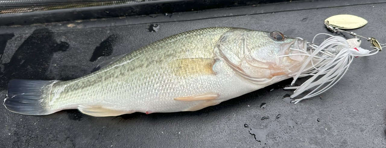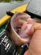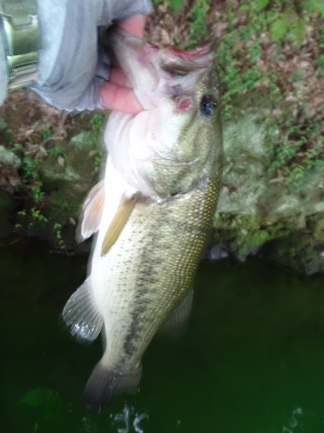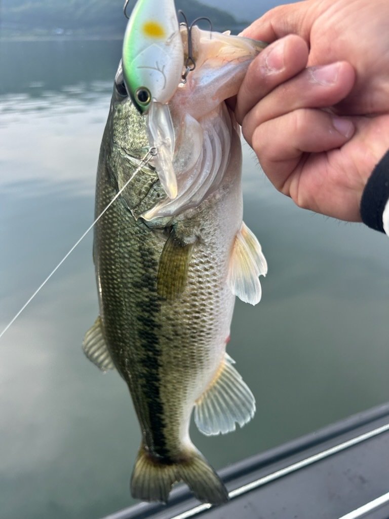 そこから案の定、全く釣れない時間が続き、いろいろなルアーを投げるも何の反応もなく風が出てきたタイミングで投げた「ベイビーブル」で20cmのバス。何とか写真も撮れたので帰宅。