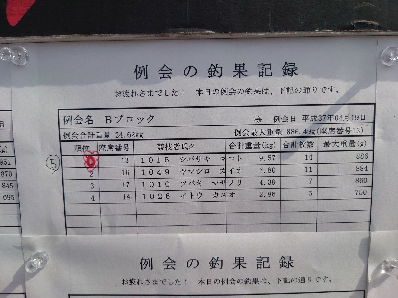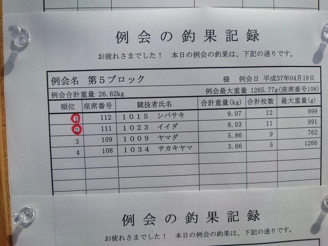 ルールでフラシは12kgカットです。あっという間に前半戦が終わりました。この時点で私は20枚釣れたので検量しました。フラシ込で10kg100gでした。休憩が30分入ります。後半戦は11:00~14:00です。幸いにもブロック内で釣れていた方なのでこのままの釣り方で再スタート。しかし1時間エサ打ちしてサワリが出ません・・周りも厳しそうです。チョーチン釣りの方が釣れだしてきました。私も浮子が動かないのでチョーチンに変更したくなってきましたが、パタパタと3枚釣れてしまい、このまま最後まで浅ダナセットをやり通したのが大失敗。午後は3枚追加で1.4kgで合計23枚で11.50kgでチーンでした。また来年頑張ります!