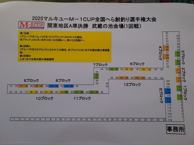 4/19(土)マルキユーM-1準決勝「武蔵の池」に出場してきました。参加は49名で12ブロックに分かれて1回戦を行い上位2名が2回戦へ。2回戦は6ブロックに分かれて1位のみが全国大会に出場できる狭き門です。予選を勝ち上がった猛者達が熾烈な戦いを行いました。抽選で5ブロック112番を引き、浅タナの準備を進めていると、水戸店のお客様が「え?・・・一緒?」と声を掛けてきました。しかも、2名も同ブロックに。まぁ~やりにくいですね。試釣を2回行なった結果はチョーチンセットが無難に釣れると思いましたが、僕はやりきれないの思いましたので、浅いタナを選択。1mくらいが一番アタリがもらえましたので、1mからスタート。20~30分は当たらないと思いながらエサを打ち返しを繰り返すと、数投で浮子に変化が出始めてくれました。しかし、さすが「武蔵の池」なかなか強いアタリが貰えず苦戦しまいた。苦戦しながらも、何とか1位で通過し、2回戦へ。2回戦も同じ釣り方を選択して、1時間8枚の釣果。14枚/9kgで第1位で全国大会の出場権を得る事が出来ました。8/30.31の「椎の木湖」は楽しんで来たいと思います。