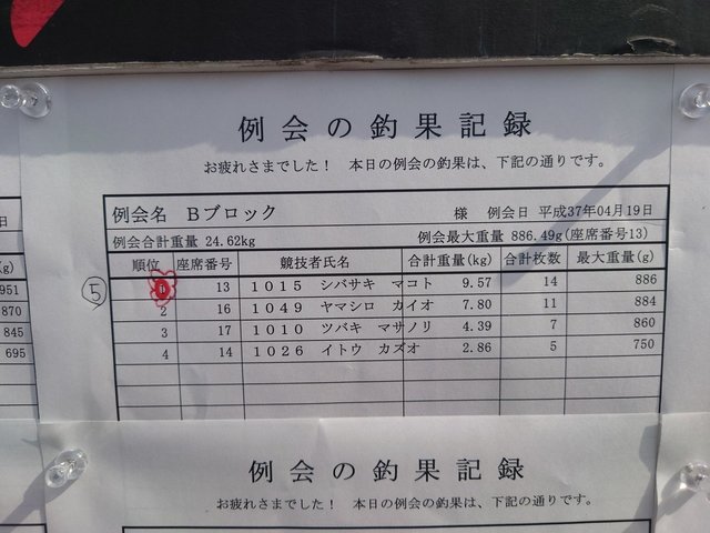 競技は6:30~10:30が前半戦で私は9尺を出してタナ80cm位からスタートしました。30分位でサワリが出て1枚目を何とかゲット。周りでは少しづつ竿が曲り始めて焦ります。9時過ぎからへらが動き出し、浮子に動きが出てポツポツ釣れ出しました。同じ5ブロックの選手が検量をしてました。