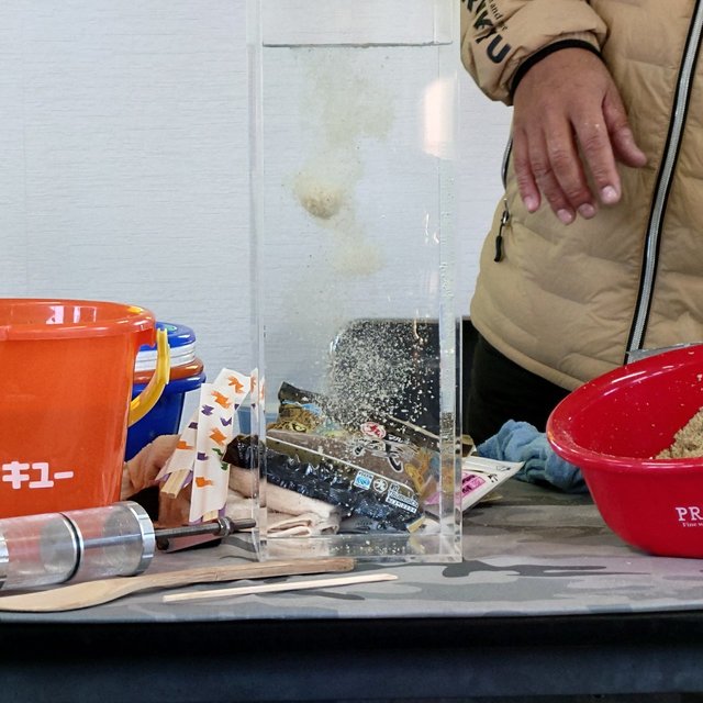 東久留米店井上です。10月下旬に発売されたマルキユー「瀑麩」の試釣会に椎の木湖へ行って来ました。へら師の皆さんはもう使われましたか??試釣会当日には、マルキユー杉本智也インストラクターをお招きしていただき、特殊水槽を用いて、直下型バラケ↓のご説明をしていただきました。わかりやすいご説明ありがとうございました。その後、3号桟橋の渡奥に移動します。この日は今シーズン一番の冷え込みで寒いです(笑)釣り座では杉本智也インストラクターの浮子を拝見しながらデモンストレーションで解説していただき、見事にへらを釣り上げてしまいます。さすがです。その後、実釣で各々の釣り座で「瀑麩」をブレンドした縛りで、釣り方は自由で開始。私は8尺メーターセットでやりました。