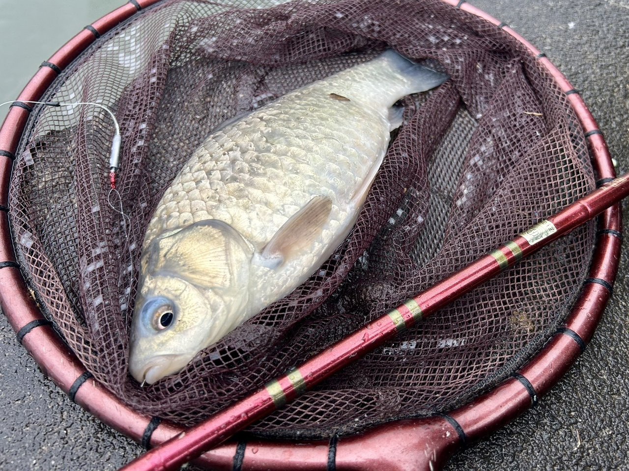 前回の対岸の浅場よりは少し水深はあるものの、中々簡単には浮子は動いてはくれず、開始3時間でようやくアタリが貰えましたが、スレで尺1サイズが降臨。