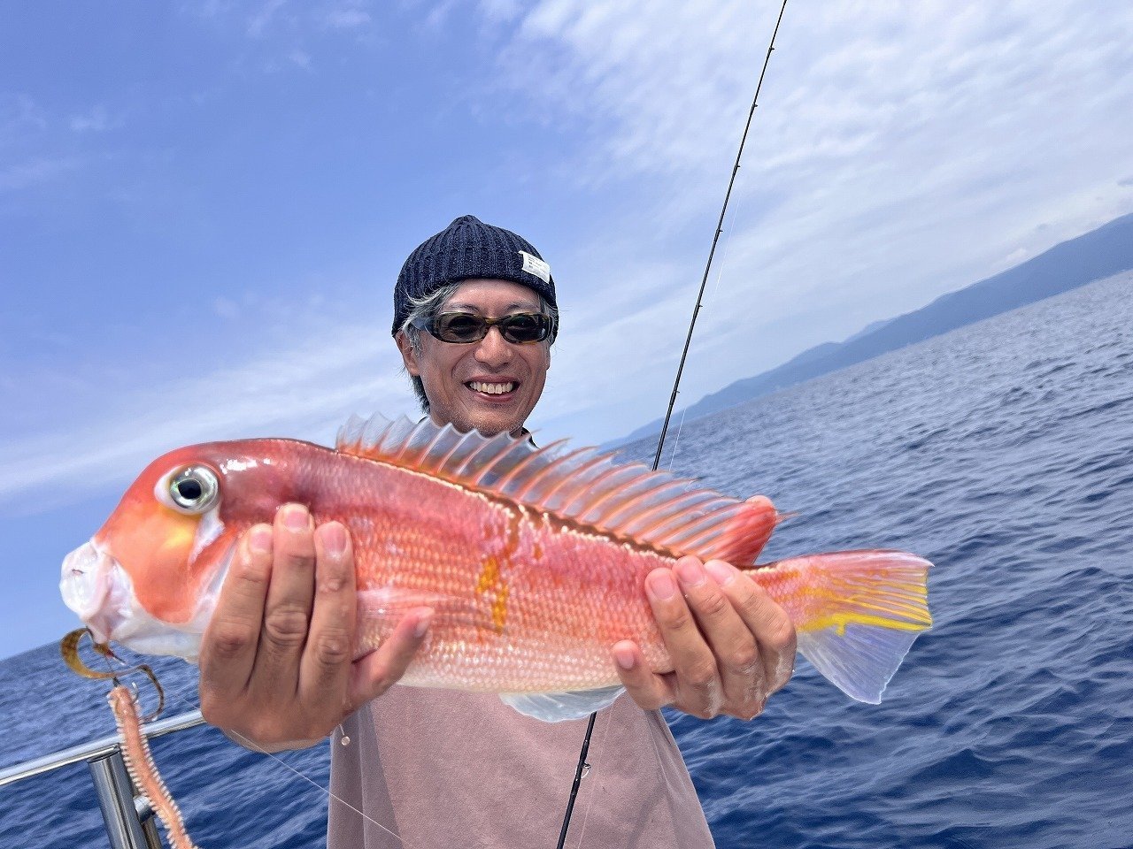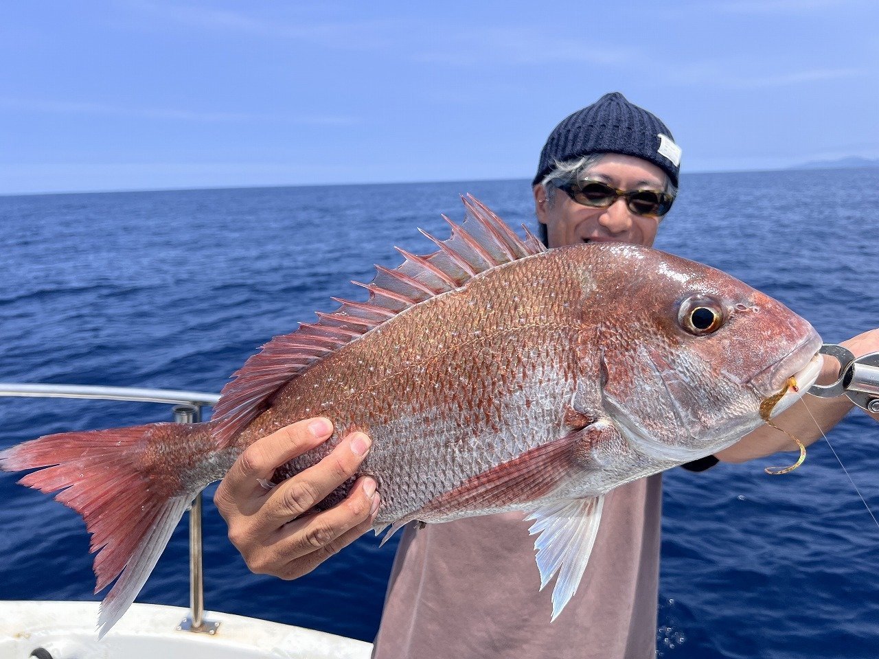 休みをこまめにはさみ水分補給をしながら釣りをしていくと、船中ポツポツとマダイが釣れ始め、待望のアマダイも出現!