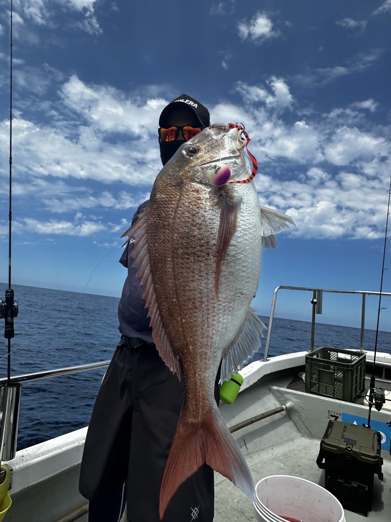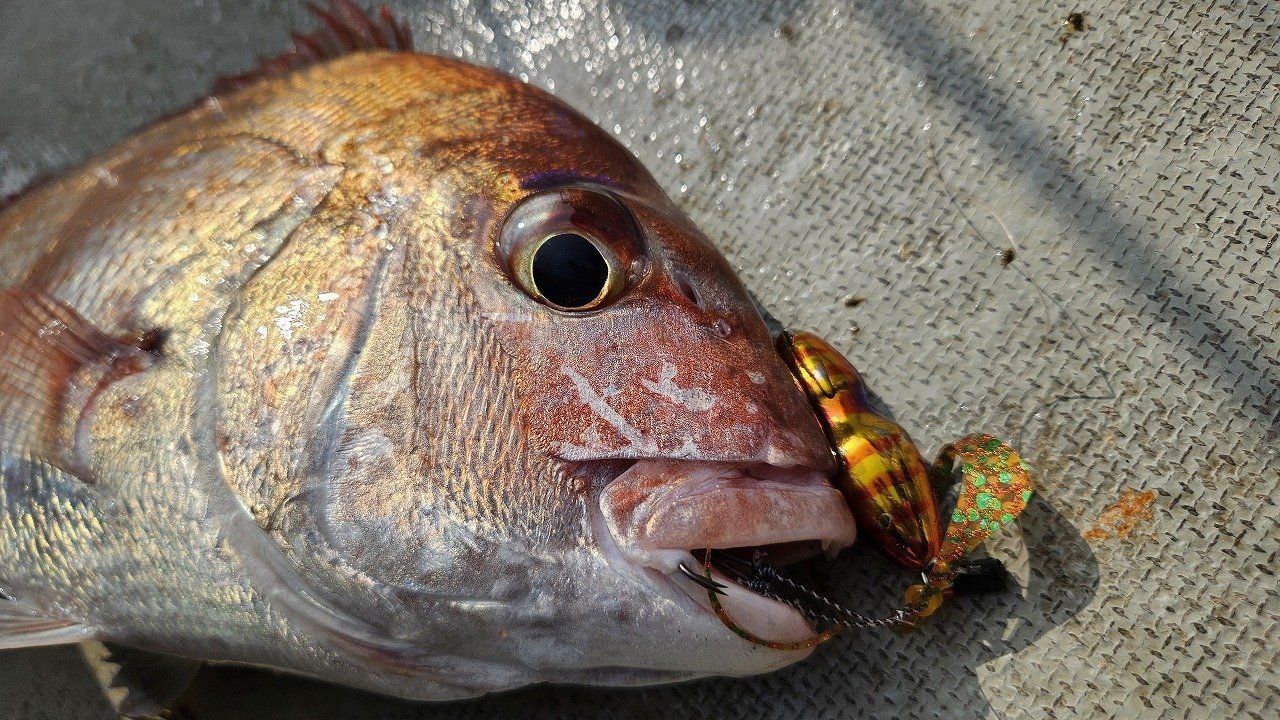 前半はあまり当たりがなかったのですが、タイラバのヘッドを小さいものに変えてから何回か当たりがあり、まず1匹目はほうぼをゲット。その後またあまり釣れる気配がなかったのでネクタイをオレンジ&黒のカールタイプのものに変え少しアピール力を出し、この日はかなり穏やかで潮もたるかったので巻くスピードもゆっくりめ、底から2ー3巻きをすごく丁寧にを何回か繰り返していたらなんとなかなかいいサイズの真鯛が釣れました!