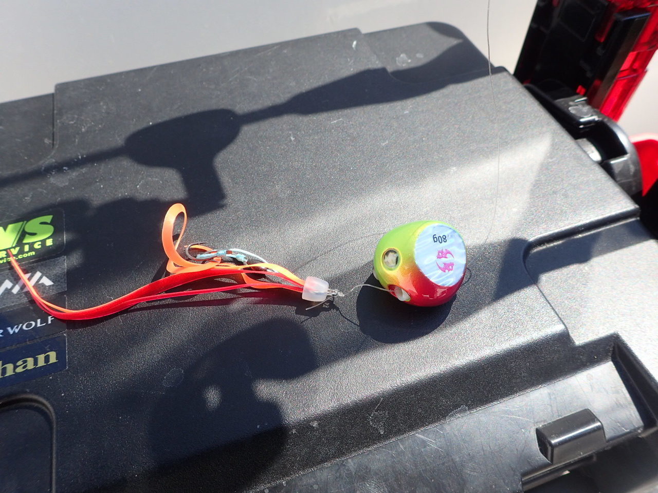 ヘッドはグリ金でタングステンの60gをセッティング、カーリーはレッドとオレンジ!