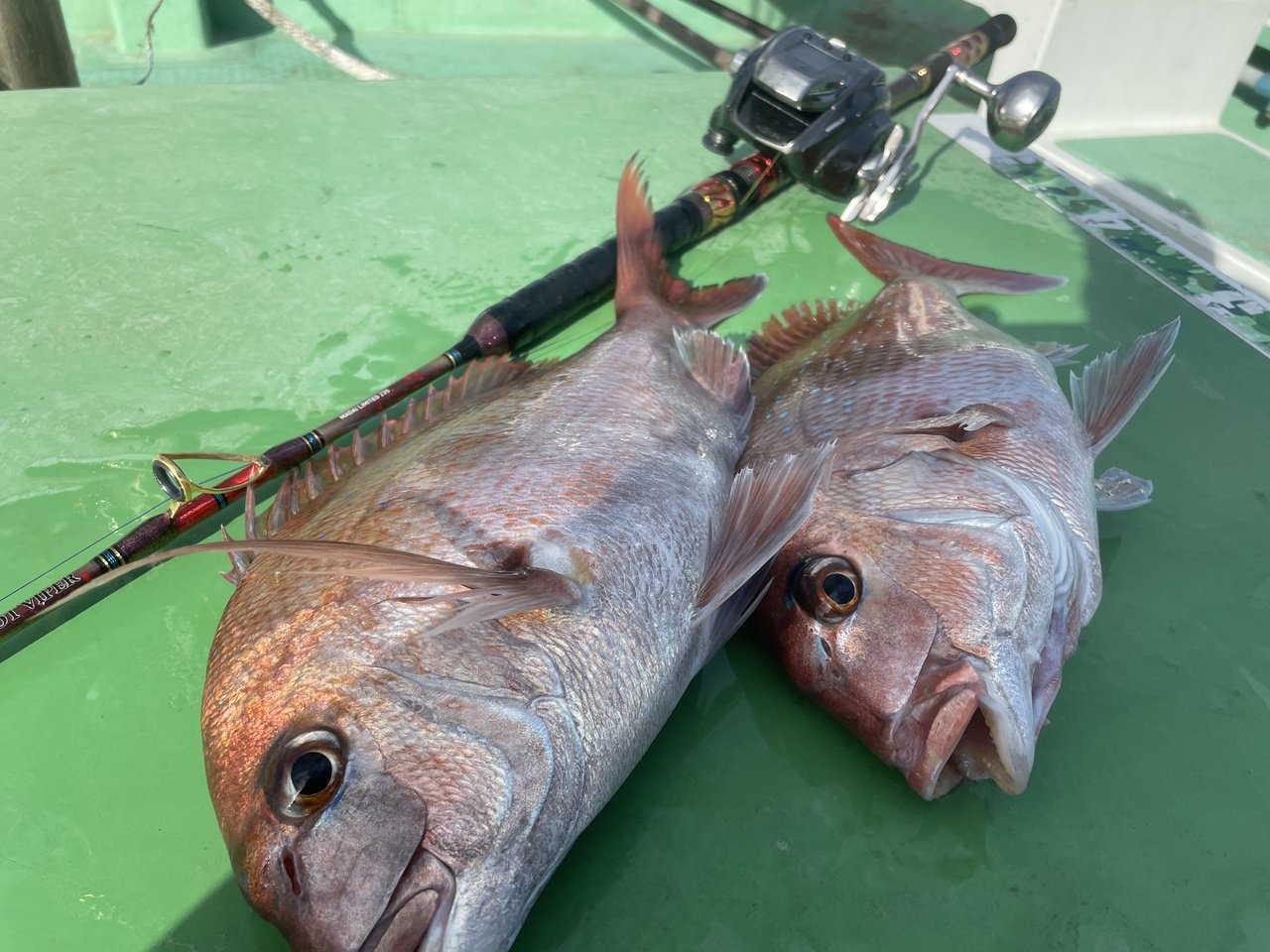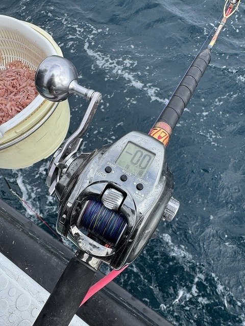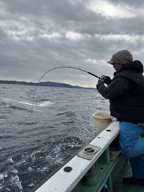 お昼過ぎ、船が流れ出したタイミングで初挑戦y様に待望のアタリが!1キロほどのタイ!続けて私にもタイのアタリが!