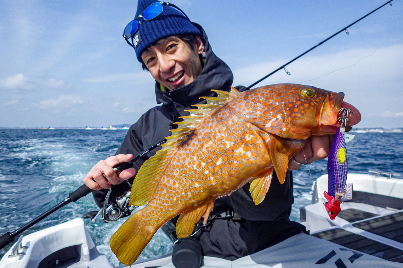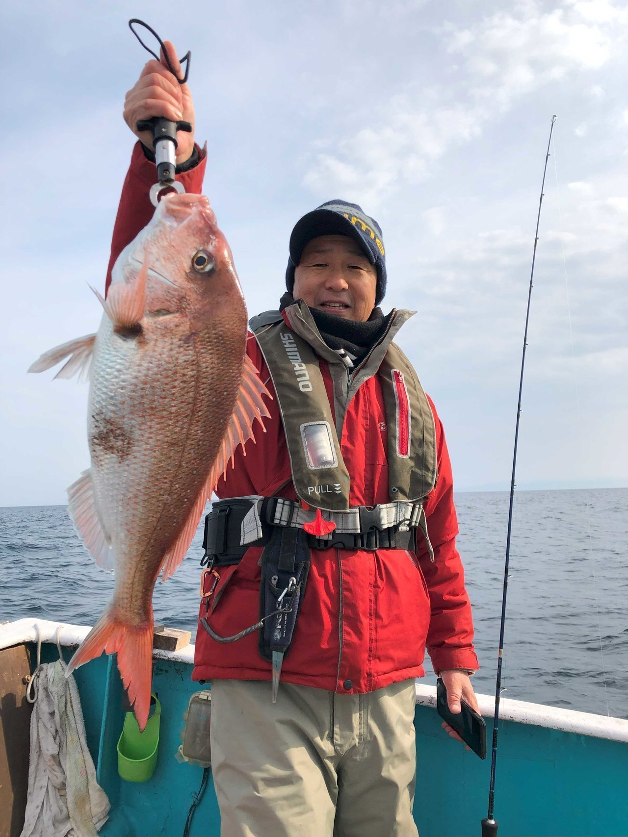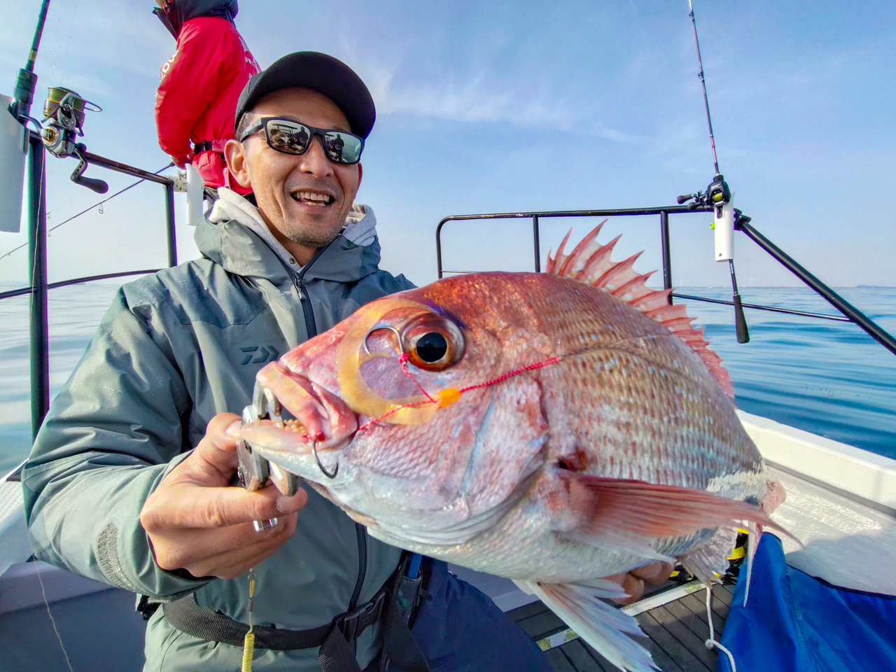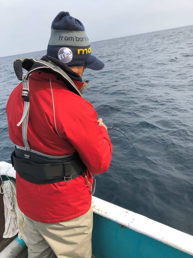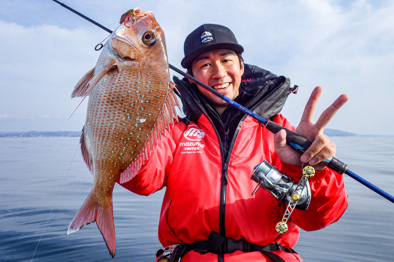 朝一は潮がしっかり効いていたのでバーチカルから、開始一投目でいきなり外山父がマダイをキャッチ!