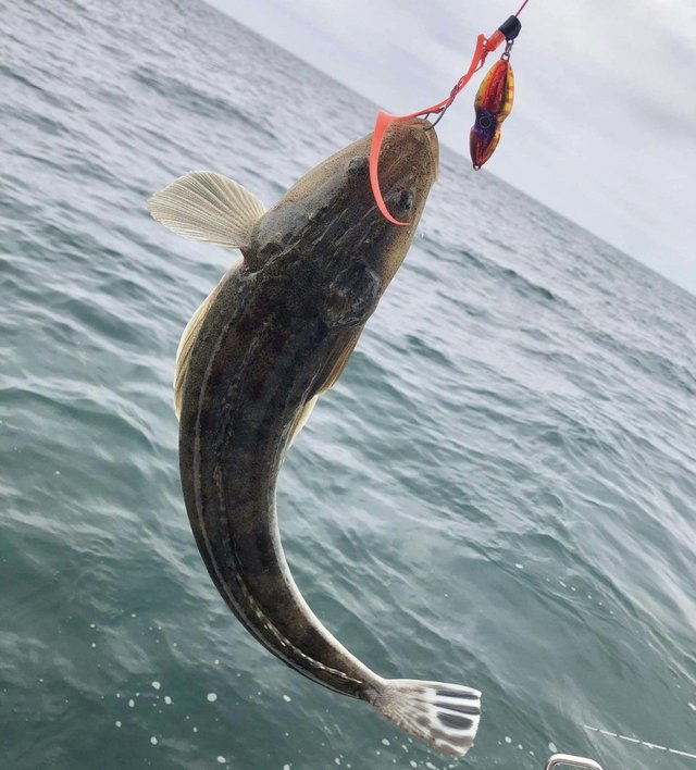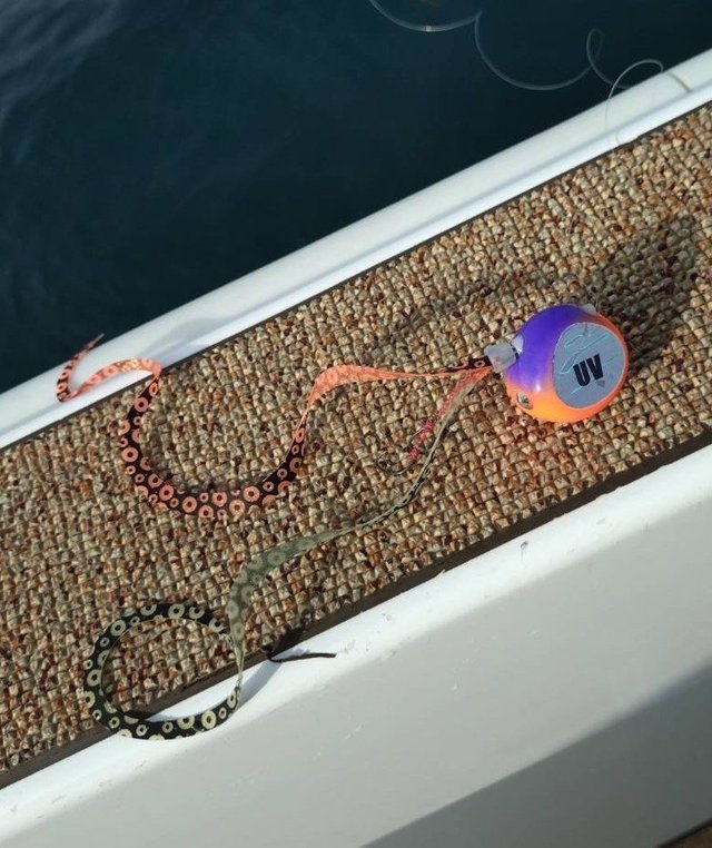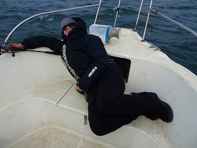 リーダーを掴んで抜き上げる瞬間のポロリ(汗)。腹が膨らんで浮かんでるヤツを船長がタモでナイスキャッチ~。あっぶねぇ~。