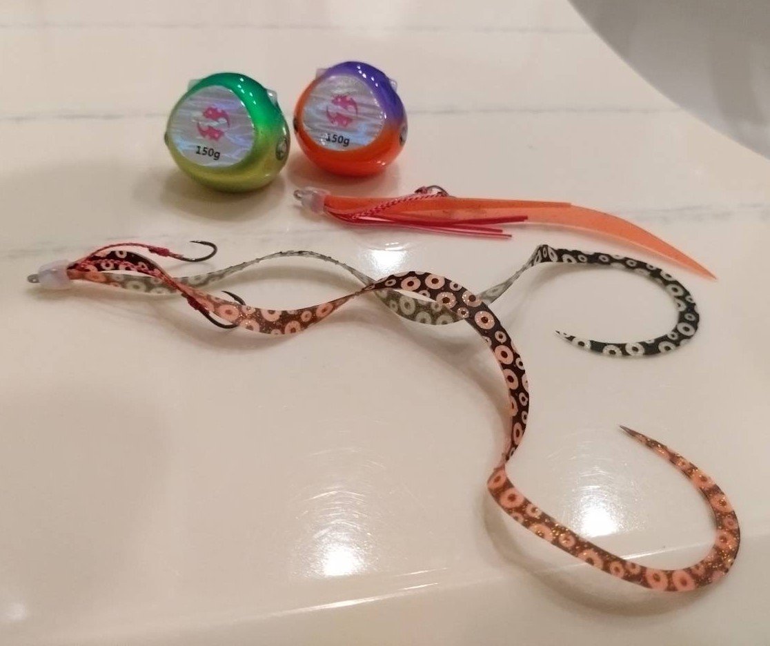 今回は水深100mエリアで120~150gのヘッドを使用。太めのネクタイよりもショートタイプが好反応のようでした!