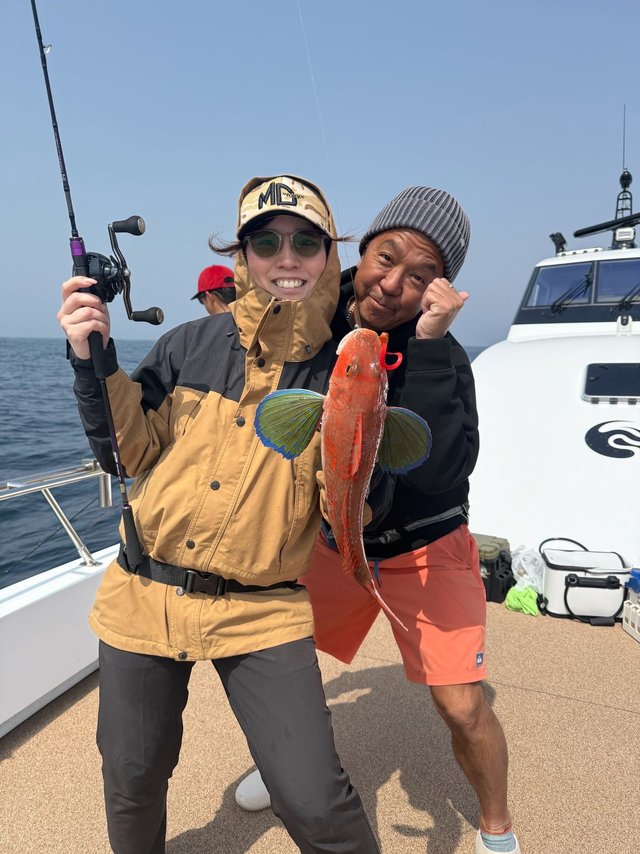 春の大ダイ狙いで新潟県根寝屋漁港第十八進栄丸さんで釣行。ポイントまで航程1時間30分弱位で到着。水深117mボトムから50~60m誘っての船長より指示。しばらくすると同船したベテランアングラーがヒット!慎重に巻き上げ見事ランディング。60cmオーバーの良型マダイをゲット!ボトムより20m巻き上げた位とのこと・・・。しばらくしてミヨシでも同サイズクラス70cm弱をゲット!アタリは少ないが出ればデカい状況。ポイントを移動しながら誘っていると同行した西田氏に待望のヒット!伝家の宝刀!TGベイトのタダ巻きでボトムから20m位。こちらも60cm弱の良型です。玉の変更、タコベイト付け変えるなど試行錯誤で私にもようやくヒット!慎重に取り込みをと思ったら水面付近で痛恨のバラシ!数少ないチャンスを逃して残念・・・。後半船中40cmアップの甘鯛、ムツ、カサゴ等釣り上げた所で風が強くなるということで少し早い帰港。今回は思った釣果は得られませんでしたが船長は丁寧にアドバイスしてくれる優しい方です。初心者にもお勧めできる船宿でした。また近いうちににリベンジしてみたい。