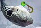 朝イチは潮がガンガン流れて、バーチカルのタイラバで勝負。船中でチャリコサイズがポツポツと、ホウボウ、クロダイなど釣れて賑やかな滑り出し。わたしにもアタリ、でもなんか変な引き?水面に浮いたのは、あらら、巷を賑わすトラくんじゃあありませんか!