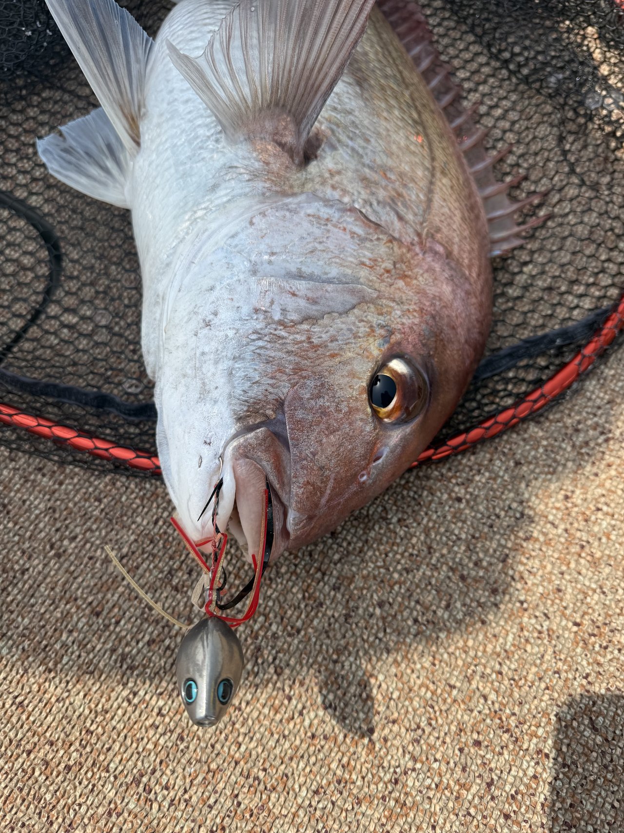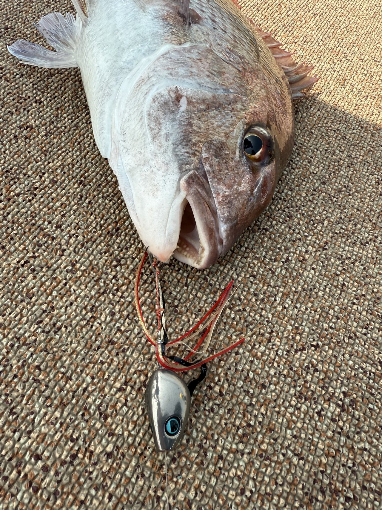 朝5時に受付を済ませ、5時半頃出船し40分ほど北上。ポイントついてまず自分は誘導でタングステンの8号からスタート。8号で十分底取りができたので前半はずっと8号でやってました。釣り方は仕掛けをそんなに動かさないで、底取りをする時に動かすぐらいでそんなにリフト&フォールをしても食いが良くなかったです。そんな感じでやってたら、とんでもないひったくりの当たりがあり、合わせると凄い勢いで糸を出していきましたがそこは24セルテートの滑らかなドラグのお陰で無事3kgのマダイが釣れました。