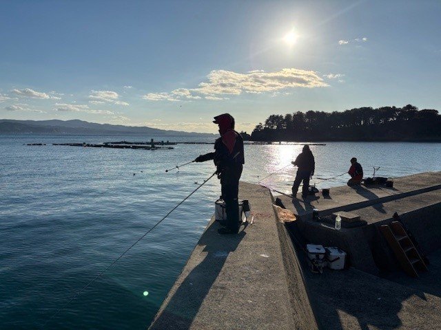 午後からは、風裏の堤防でグレ釣り続行。佐久間&渡邊でテトラ周りの良さげなポイントにコマセを撒くもほとんど何も来ない…!なんでー!佐野&佐藤のポイントが調子良さそうだったので近くにお邪魔しましたが、元気なチャリコとカサゴで終了。寒グレ(またはチヌ)釣るまでまた頑張ります!