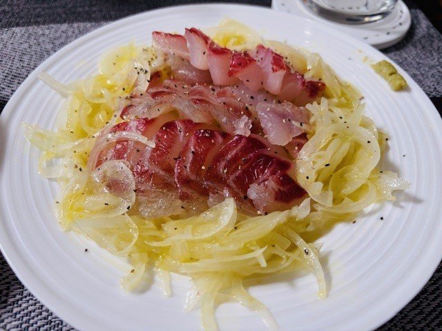 地磯で釣れたチヌは、お刺身とカルパッチョにしていただきました。脂がのっていてとても美味しかったです♪