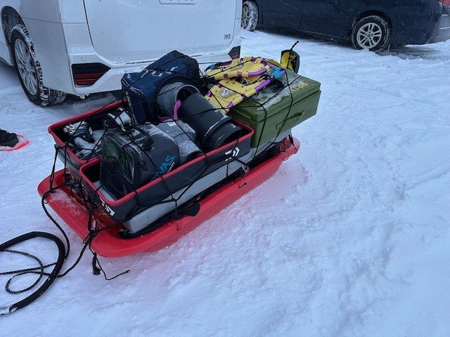 泉BP店、脇神です^^ちょっと遅れましたが、氷上ワカサギ1発目!桧原湖のこたかもりさんより湖へ降りました。反応はそれなりにあるのですが、なかなか口を使わないマイクロワカサギに大苦戦。あの手この手で?なんとか3束に乗せることができました。ソリを引っ張るのには苦労しますが、氷の上で釣りをするのは最高ですよ!エリアも徐々に広がっていますのでぜひチャレンジしてみてください(^O^)ノ※現時点で桧原湖はカンジキ・スノーシューは絶対条件ですのでご注意ください。