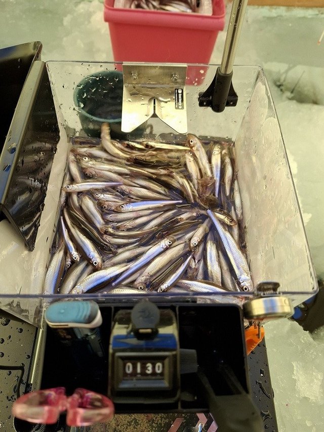 不安な気持ちでワカサギボート船に到着して道具を用意して魚探を見ると、湖底付近にポツポツと反応があり、仕掛けを入れるとすぐに反応があり幸先よく釣りあげるも、その後はほとんど群れが入らずに苦戦、40匹を釣りあげてそのまま納竿となりました。氷がとければまだチャンスがあるのでまたリベンジに来ようと思います。