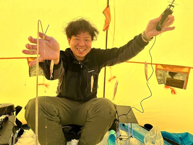 当日は朝7時に湖畔で受付を済ませてから出船し、湖上に設置されているワカサギのドーム船へ移動。到着後、さっそく釣りを開始しました。